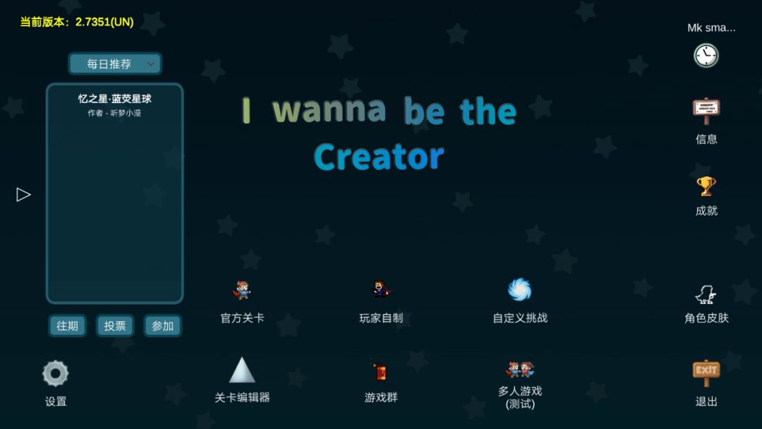 给X提个小意见或许以后的版本可以加些死亡特效之类的,可以让玩家可以改一下主界面的音乐和背景把IC搞得花里胡哨的()