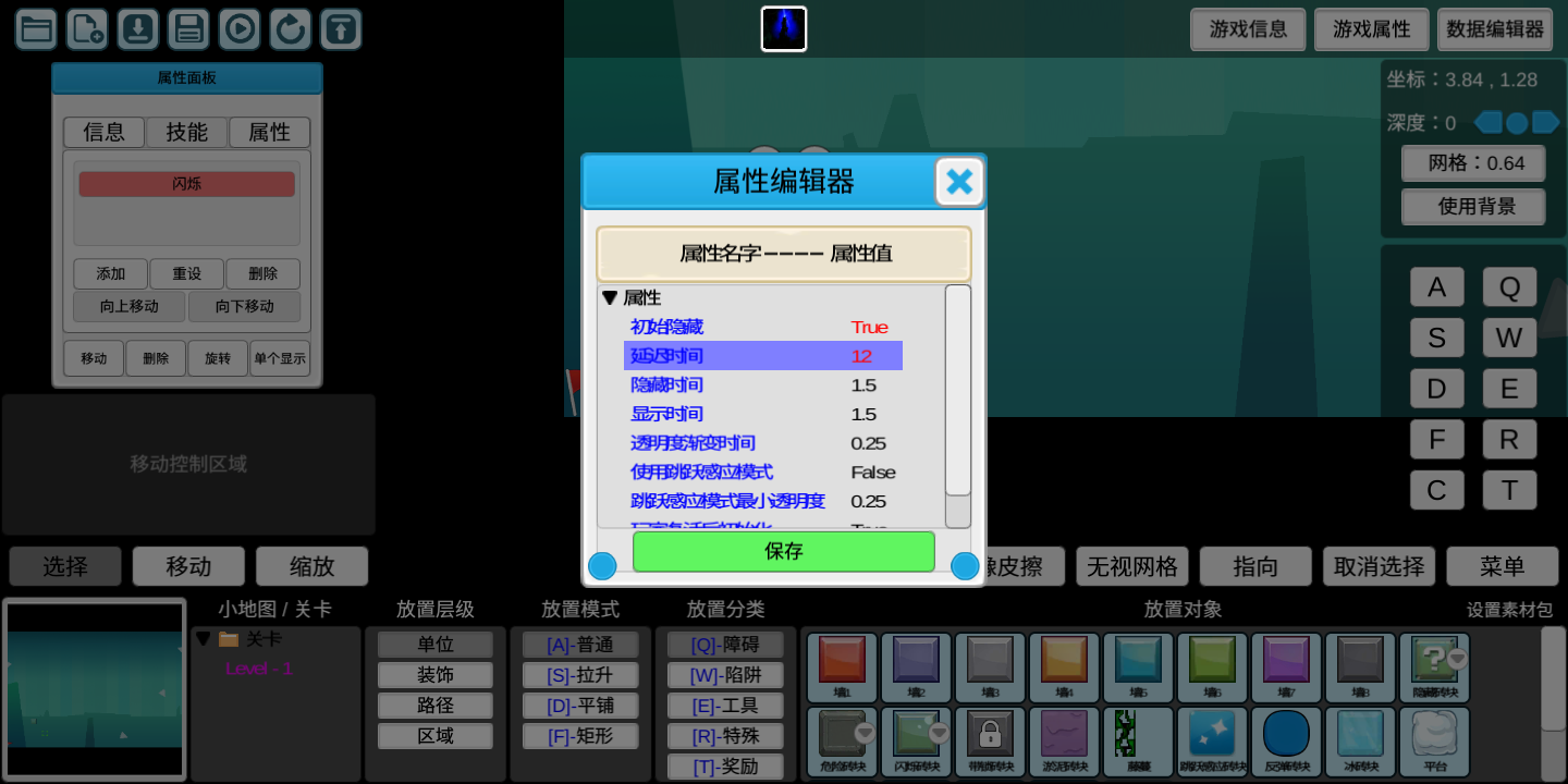 我想问大家一个问题,就是这个编辑器里的闪烁技能,我想让这个砖块过几秒后开始闪烁(之前一直是隐藏状态),但是我调延时这个参数好像没反应诶,大家能告诉我这是怎么一回事吗