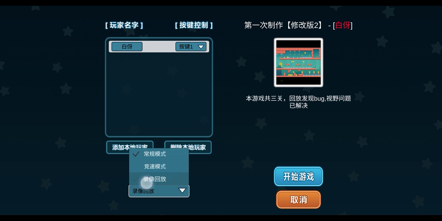录像功能出现了BUG,本以为是设置出了问题,改了四遍终于确定了,录像出了问题,我在自己设置的地图里录像,来来回回,只要到了这个角落,人就会不见,还有这个通关明明死了好多次,硬是给我一命通关…