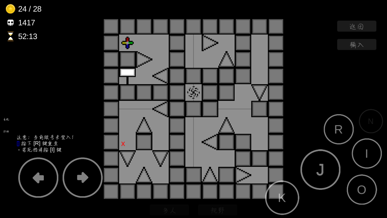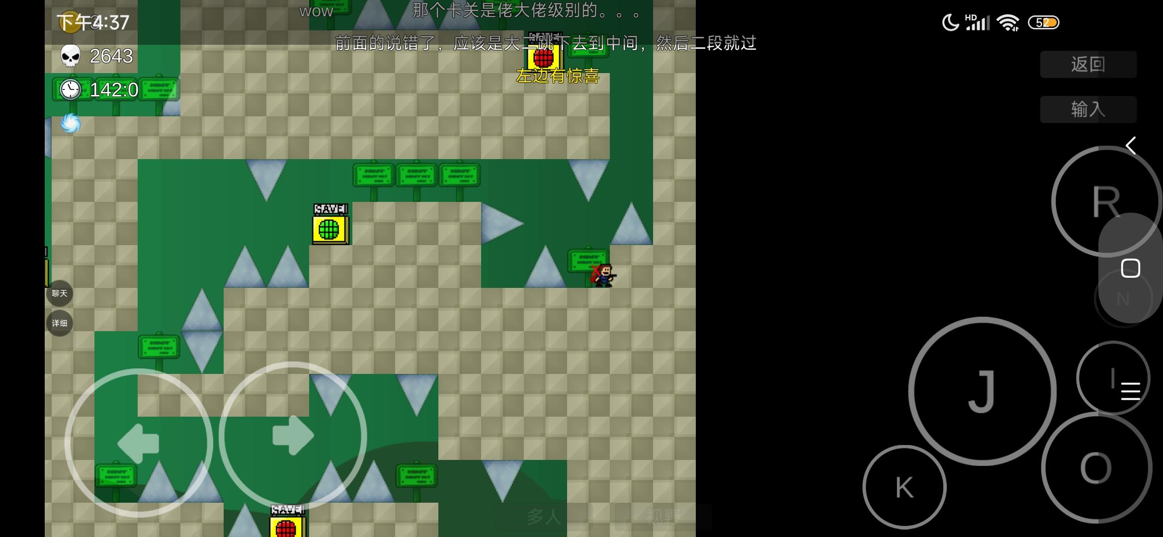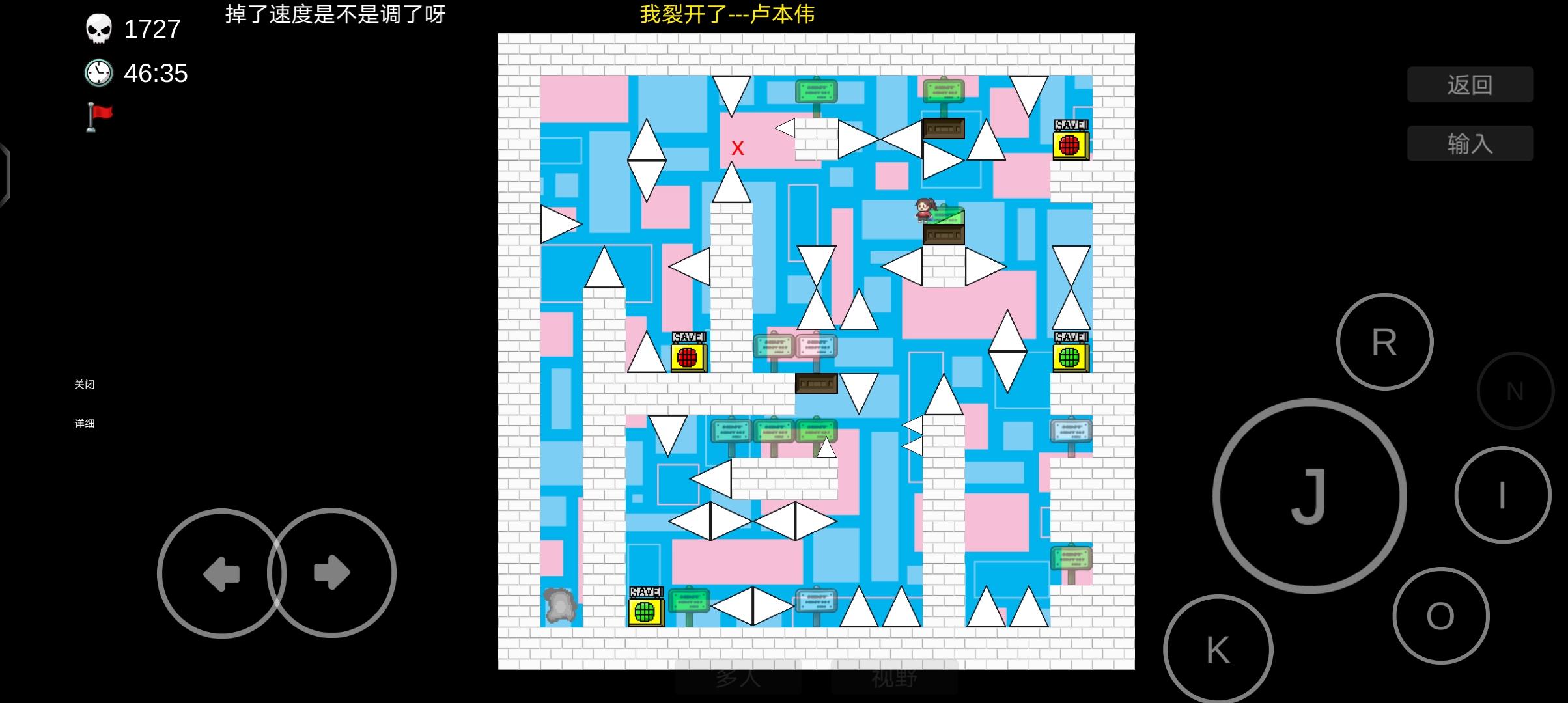 依旧是卡关的日常,摊牌了,我是菜鸡p1是相位空间,我真的死到崩溃。主要是两条路我都死了几百次了。一种是从坐上移到右下,跳刺过。但这可能吗兄弟们?另一种我感觉可以先到左下那个竖条再到右上竖条再到左下再到右上,然后就好跳了。可竖条那儿也很难跳啊枯了。在线求个正确方法。p2那个苹果到底怎么勾引??第一个还好,但第三个我勾不下来啊勾不下来。p3那三个大尖刺是给人玩的吗我吐了,怎么滑啊?