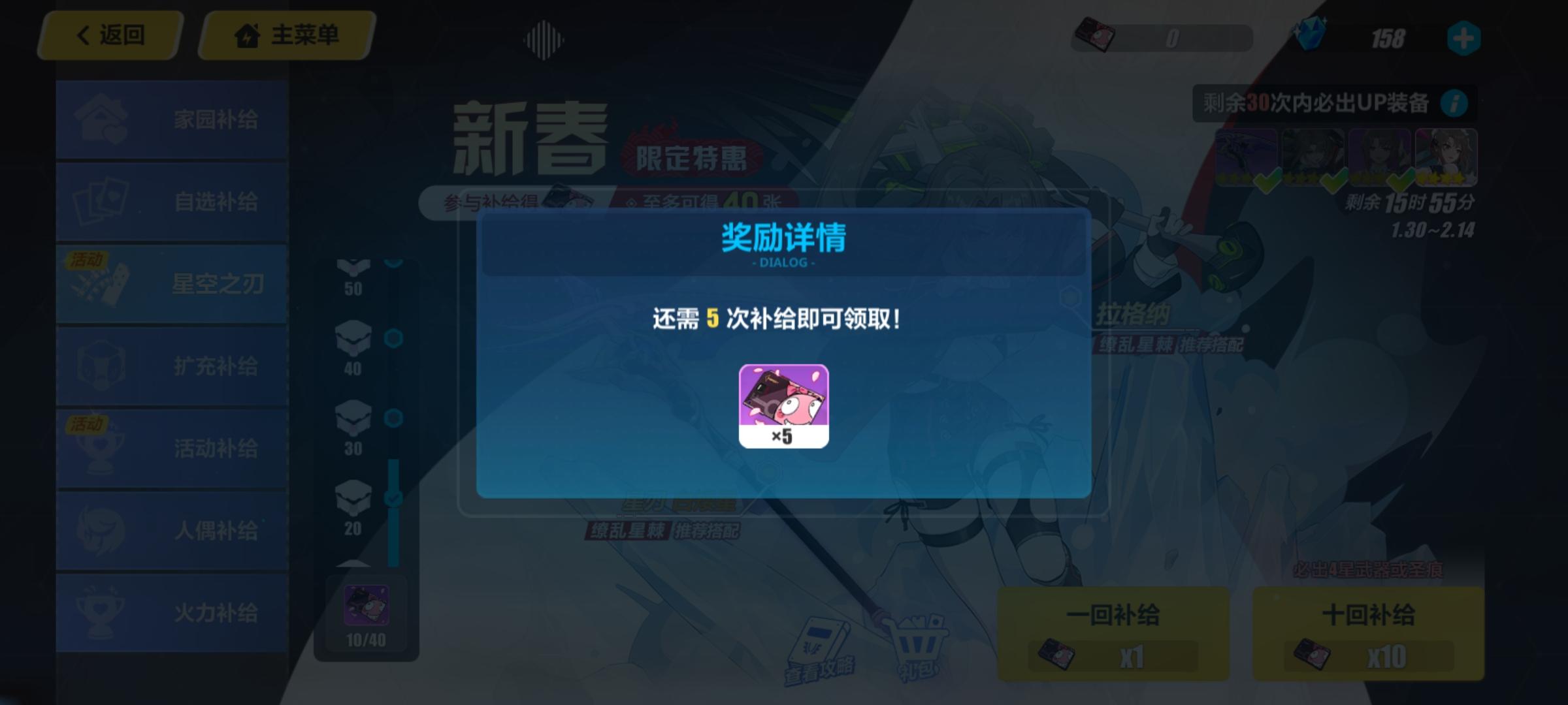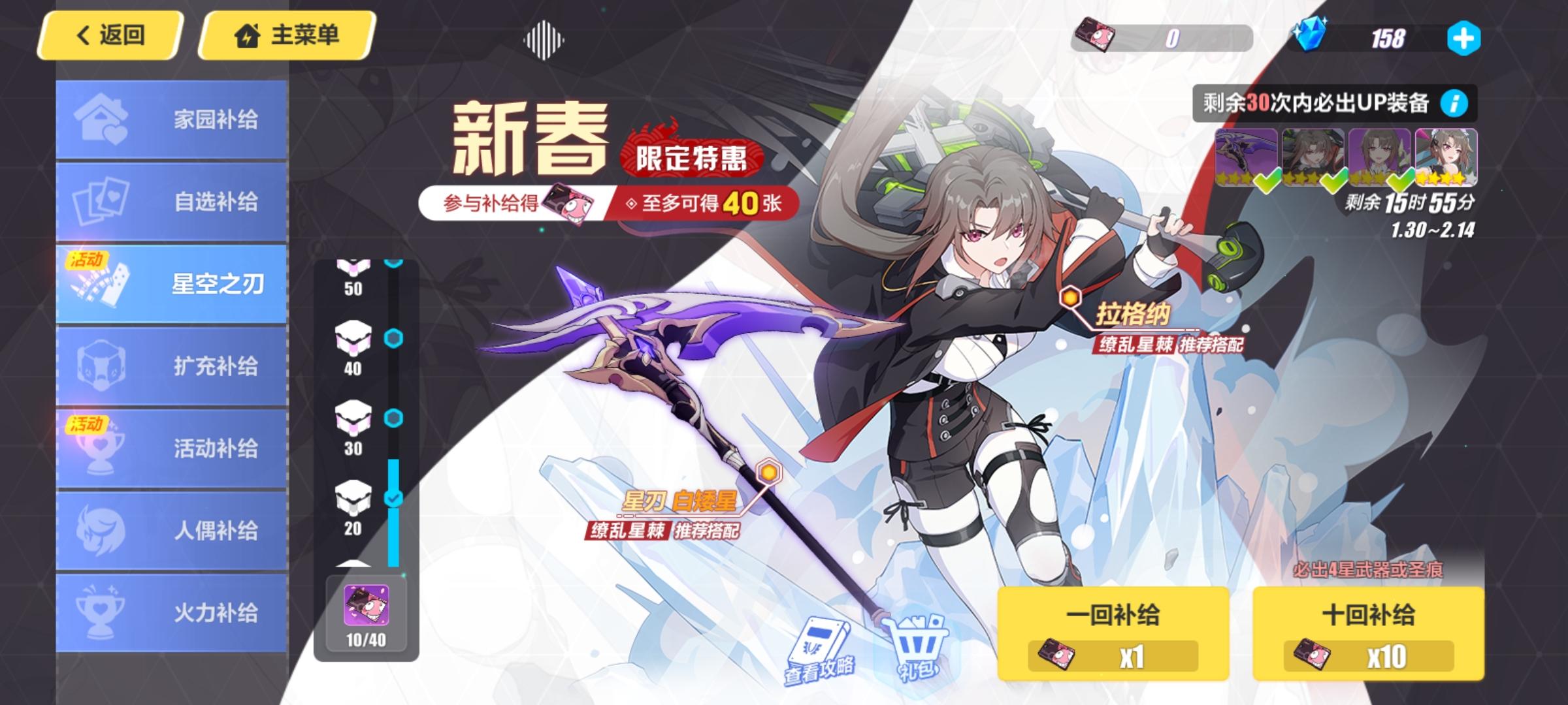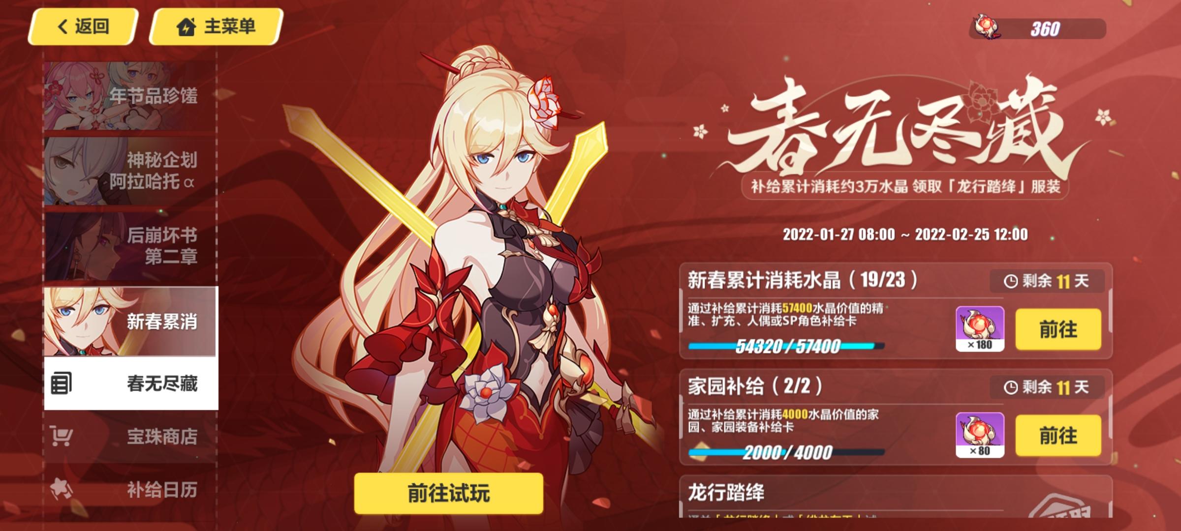首先纪念一下自己的回归号在一穷二白的情况下,在春节欧气满满。战况如下:7发单抽出天鹅,一发十连出专武6发单抽出识宝,2w氵左右直接毕业30发左右毕业星塔心血来潮一发十连出炎律其他十连爱莉希雅蛇专武各歪一把而就在刚刚,再次心血来潮抽了一发天命武库,羽渡尘到手,在来两发卡罗尔专武也有了抽完直呼不能接受最后,祝大家新的一年欧气满满