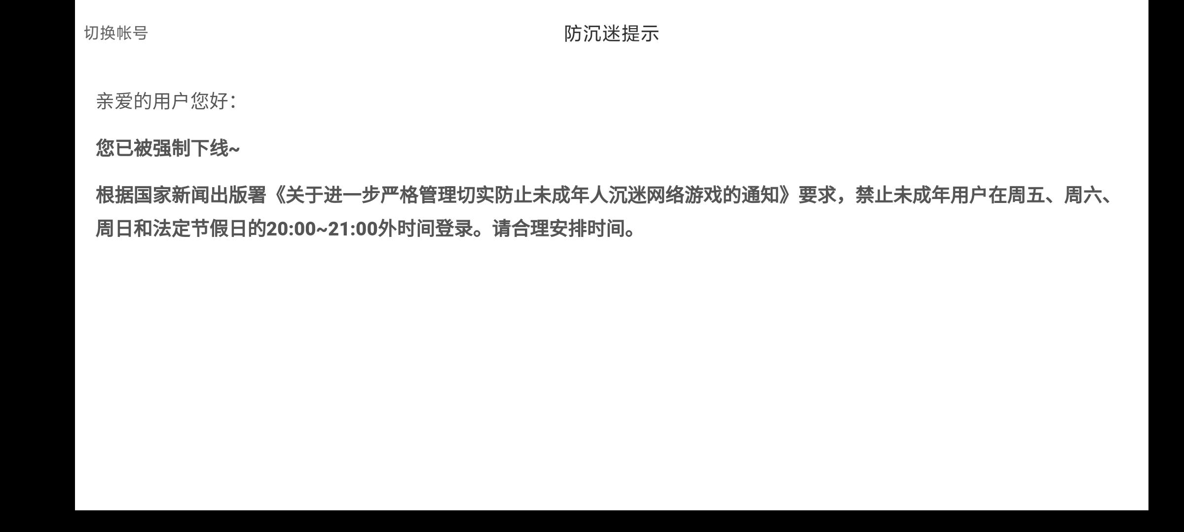 我就很好奇了wc,八点十分周日,不让上号是什么鬼啊,什么玩意防沉迷,高三好不容易可以回来玩玩,真醉了🙏
