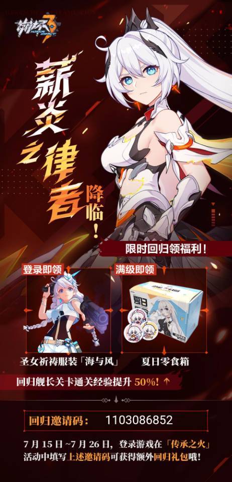 《崩坏3》薪炎之律者降临!登录送琪亚娜夏日服装,还有满级零食箱派送,赶快来看看吧:https://mhyurl.cn/66aVFBA6,现在回归在「传承之火」活动中填写我的邀请码( 47577658)还可领取水晶礼包哦!