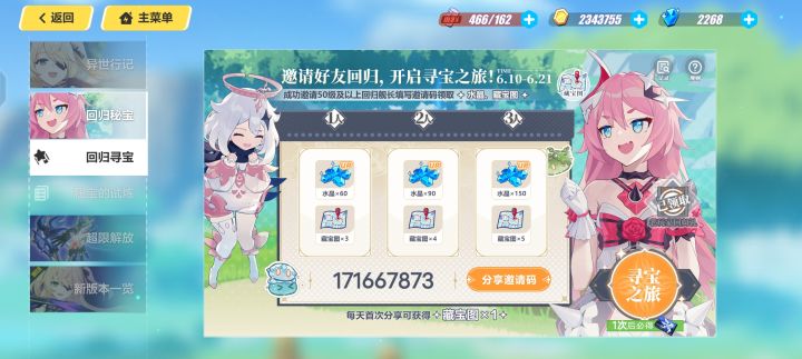 「崩坏3×原神」联动开启,登录就送「菲谢尔」角色卡!,新玩家、回归玩家填写我的邀请码47683452还可额外领取水晶等福利!查看新版本介绍:https://mhyurl.cn/9369EBA6