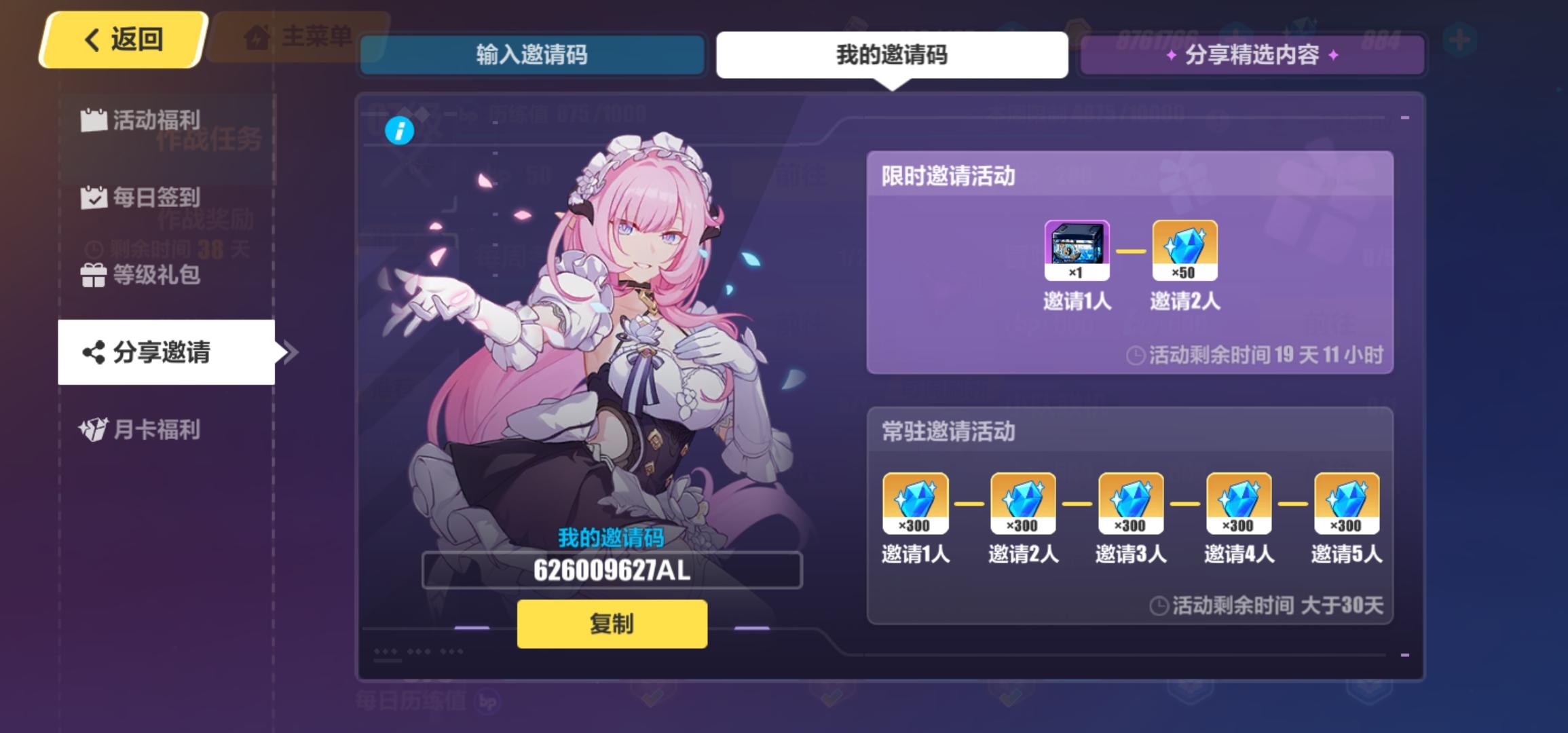 崩坏三300水晶兑换码RB66KBKR3TBBJSP62B292BSFLAPNJB2R2TBK3T7P2AK8KATPVBP7JA292TVB10月10日23:59过期,没换的尽快萌新和回归大佬可以填一下邀请码:623363172JJ😘