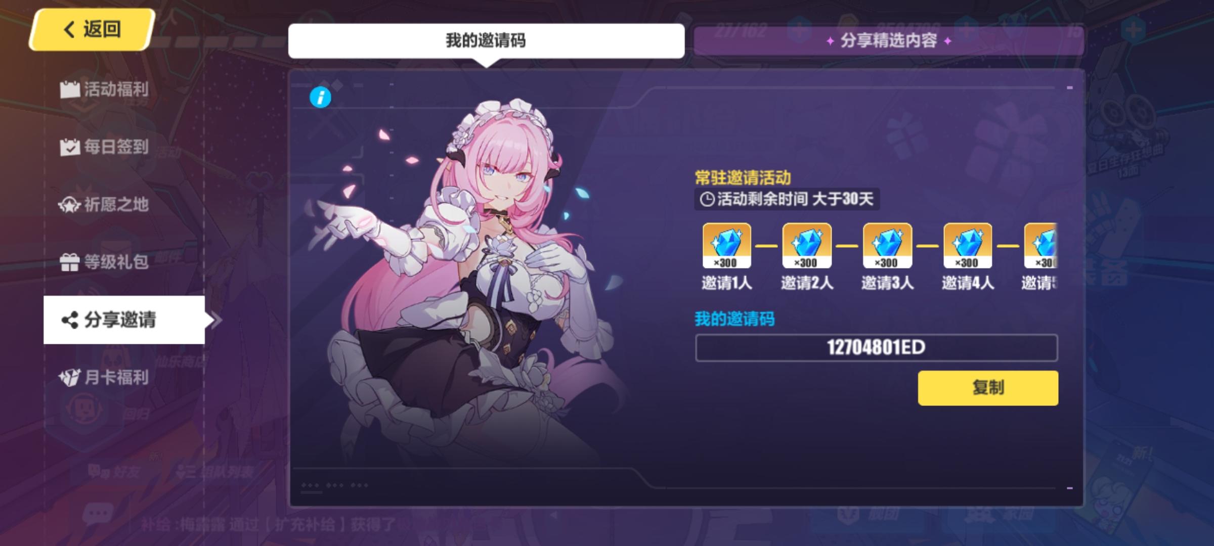 求填邀请码135018309GH,很馋那1000+氵,爱莉没抽到专武,目前连个好的下位替代都没😭