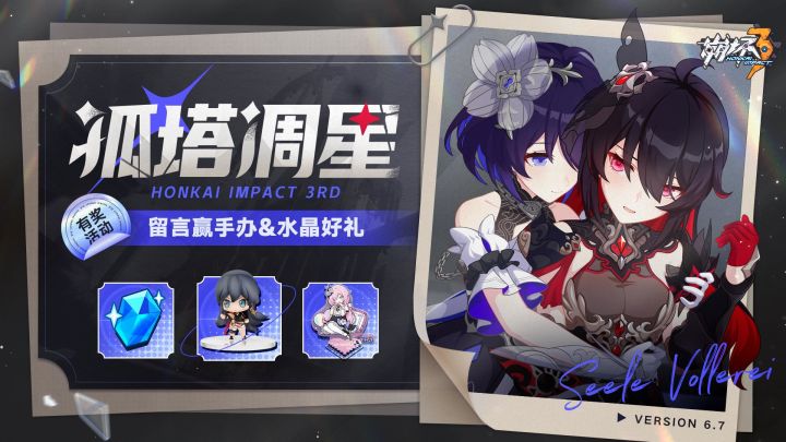 6.7版本「歧路星语」即将开启全新SP角色「糖露星霜」、主线第38章「孤塔凋星」、主题活动「☆完美演出☆」、「碧海邀游」系列新服装等重磅更新情报一一揭秘!TapTap《崩坏3》游戏详情页现已开启新版本预约,预约成功的舰长即可在第一时间获取游戏资讯及版本更新通知~参与本期社区活动,晒出新版本预约截图将有机会赢取水晶及周边好礼!2023年05月27日~2023年06月01日12:00步骤一、