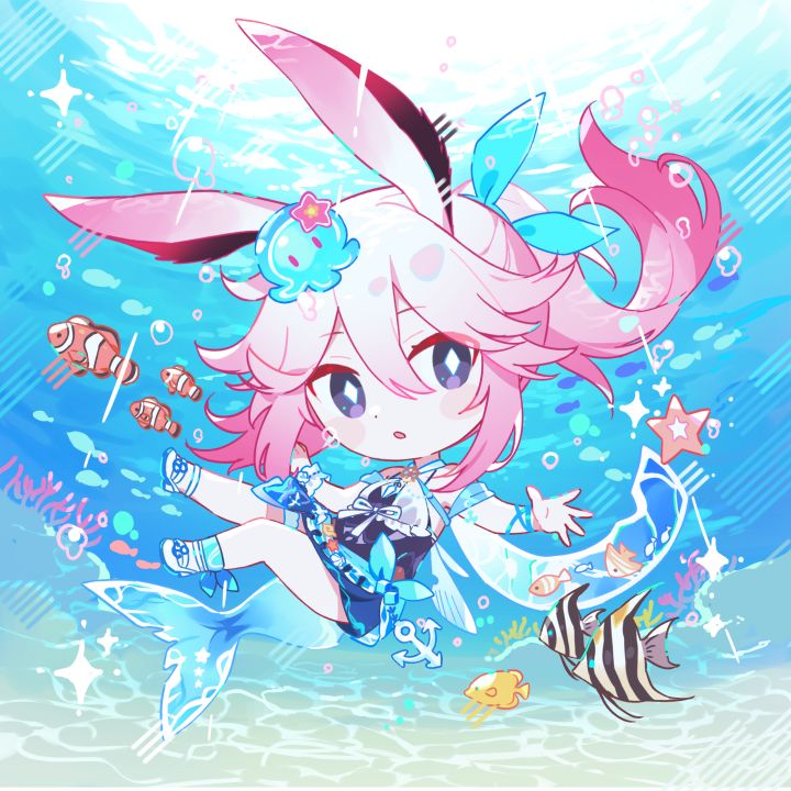 如矢车菊一般湛蓝美丽,如水晶石一般明亮清澈。群鱼萦绕,日光婀娜。而你,似一曲海中流动的歌。八重樱,生日快乐!感谢舰长 那流 的精美同人创作!
