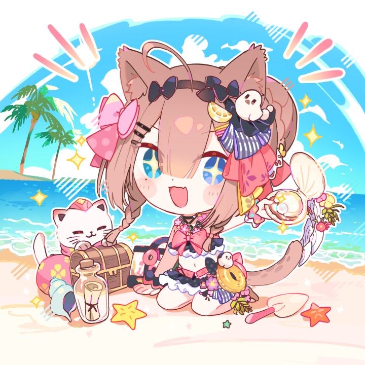 湛蓝的天空下,微风轻抚海湾,白浪追逐沙滩。“夏日的海滩最棒了!有珍珠贝壳、阳光海浪,还有咱最爱的猫猫跟宝箱!”帕朵菲莉丝,生日快乐~!感谢舰长 那流 的精美同人创作!