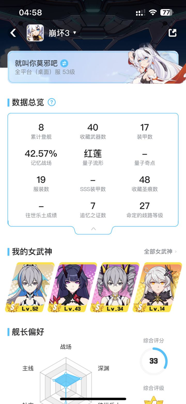 有图有据我曾经也是新手,这是一个平民玩家的历程,我就把想说话说一下想看的可以看一下,我现在脱离了新手变成了菜鸡,不想特别肝,有自己简单的快乐,建议尽早拜师有人带这是最后的,因为他或者她愿意说你两句是为你好,想变强就要思考,下面我说一下心得与对这个平台的看法,首先看到新手池子一定要使劲抽,把版本之子抽出来,然后你就狠狠的养她,我这样推荐吧,建议搞人律你可以割草,搞出来之后建议拿到雷律,因为是信仰,像我最喜欢的就是雷律,在谈一下绅士的话题,但是我做喜欢看失落,请想养眼的玩家尽量拿到手去试试乐土边跳舞边细细评味我已经累了要开始简单的快乐了,群里活人不多也都是兴趣使然,,拜师要看清人我只收一个多的不想带,谢谢大家,在这里提前祝大家新年快乐作者很懒,喜欢装死,每天要做要用心玩的游戏太多还有累死写评论所以当我不存在就行了