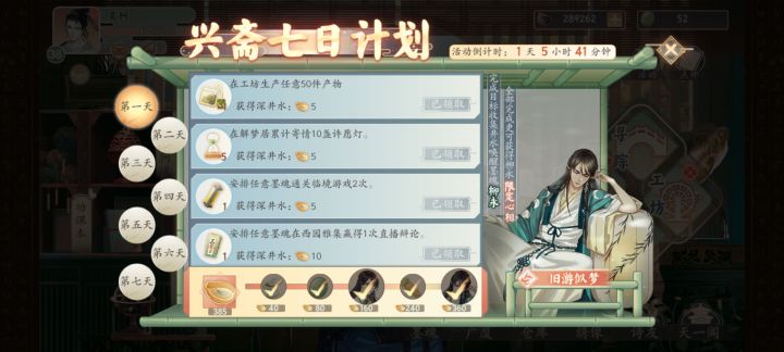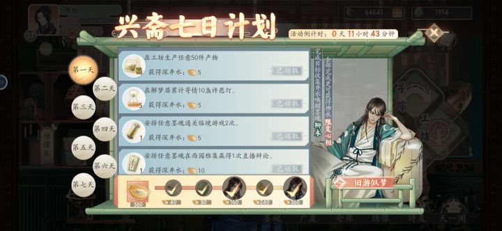 虽然也是是萌新,但是根据我玩小游戏的经验,习惯性一进游戏就把所有功能窗口都浏览一遍,然后慢慢了解各种数值是通过什么提升的。然后发现了非常传统,我称之为入坑头七(不是)的励精图治,一般我玩游戏最肝也就这七天吧,我很佛的其实,可以看到虽然得到了柳永的心相但没做完全部任务。下面附上的是所有任务的截图(每天八个任务一共七天)第一天共计50深井水第二天共计45深井水第三天共计50深井水第四