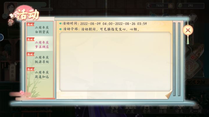 活动概要:兰台可前往活动面板,通过完成对应任务、进行商城购买、达成收集目标等形式,获取限定家具套装【墨痕斋课堂】,以及壬寅年双节限定书信。