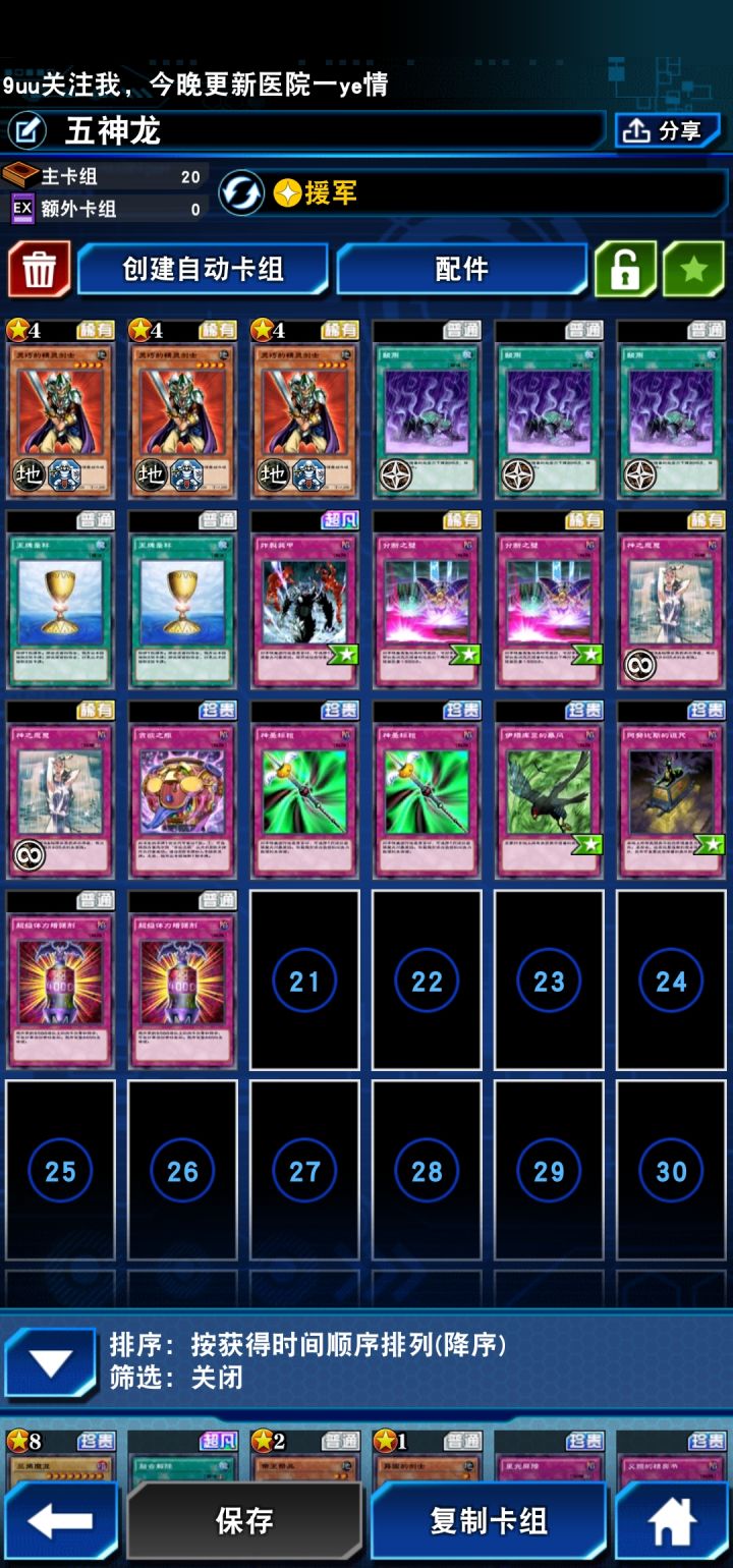 很平民刷五神龙卡组(分段,炸甲不是必须品,换其他坑一样可以)剑士让高功怪过不了,不过五神龙有一只1600攻的怪能过,所以说场地我带了酸雨,能过任务以外把剑士防御力提到1600,这样就是完美墙壁了。其他卡的话放一些回血的卡过任务,和放些坑防卡手就行了,技能带援军或者抽卡低星都可以,都是为了检索剑士。后面让对面抽空卡组获得胜利就行了。然后还有一张卡是有必要带的,贪欲之瓶,防一手卡组比对面少。