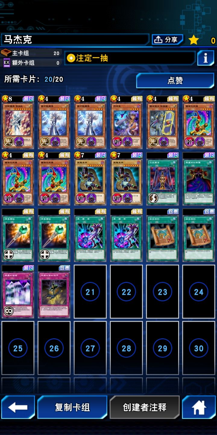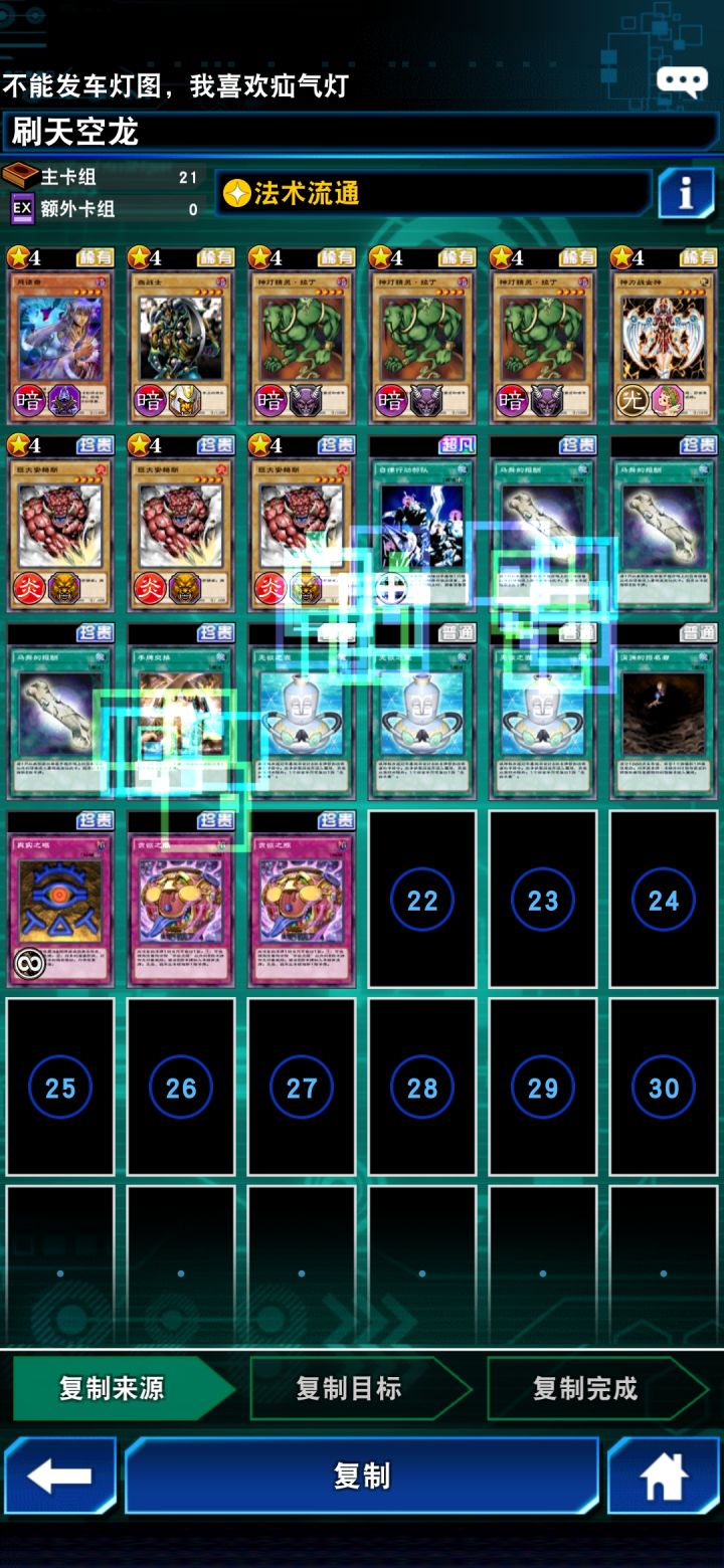 首先说一下核心思路。就是利用月读命的效果。反复改变天空龙的表示方式。翻转召唤就算召唤一次天空龙了。卡组就是这个。很垃圾了。没有魔力爆发。深渊的指名者也只有一张。刷了大概1个多小时。就刷出卡垫了。基本操作就是一个普通的1800怪站场。然后发动深渊的指名者。选择神。幻兽族。对面的天空龙就进墓地了。然后用自律部队或者战线复活的代价。拉出天空龙。拉出的本回合一定要有月读命在手牌!!!利用月读命效果把天