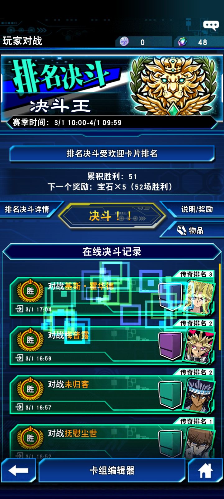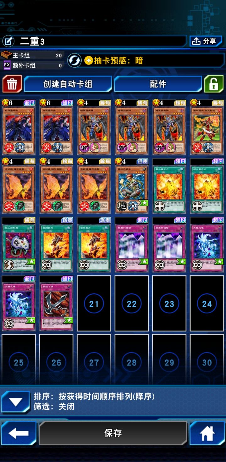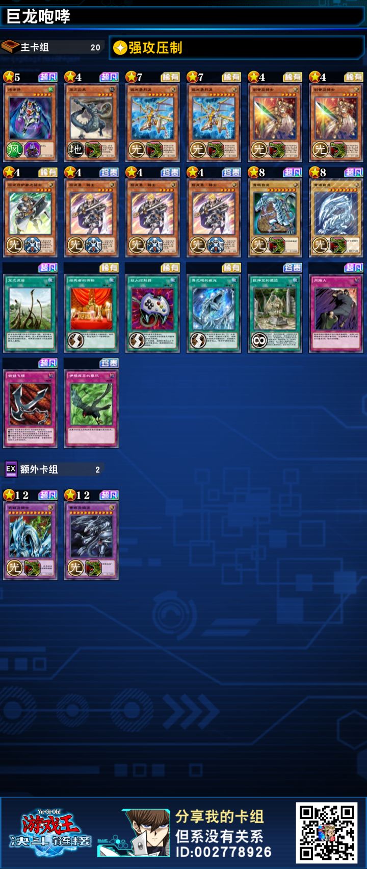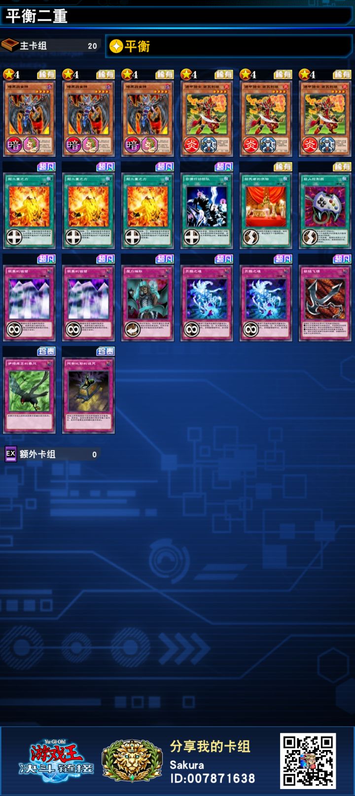 直接上图平衡二重打起来很稳,稳扎稳打就能上分。发出来大家可以借鉴。家破人亡: 二重先手有点劣势,而家破人亡可以弥补一些。平衡起手必定有魔法卡,用家破人亡相当于对方回合发动死奠,还能看对方手牌,运气好可以消灭很多个怪兽,我反正送墓过两只牛头鬼,很爽。就算扔的魔法卡是超二重我感觉也不亏。自律行动部队:上个月针对白龙,这个月针对所有主流,拉对方格蕾丝让他丢魔法卡都是常见操作。魔力抽取:力量场地也
