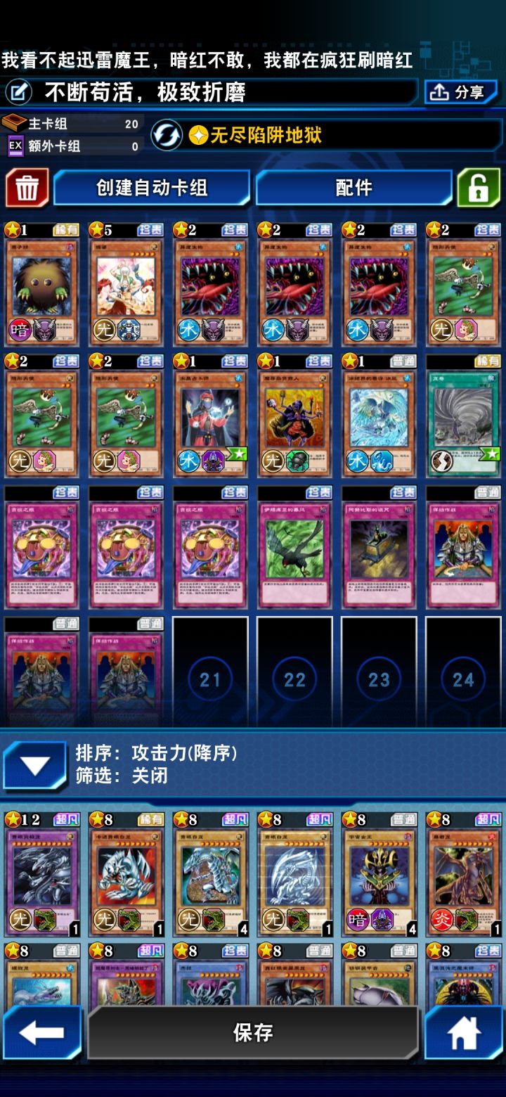 上王后就在准备这副卡组了,测试了几天,这副卡组没问题,胜率在50以上,就是到决斗王后大部分人都不用主流卡组了,没有机会在普通排位试试。思路:反向削卡,目的不是削完对面,而是增厚自己卡组,不断苟活,对面拿你没办法,极致折磨。虽然是增厚卡组,但是尽量别带超过20张,这样会加大摸到关键卡的概率,3张贪欲之瓶能增厚12张,技能把墓地陷阱回卡组又能增厚几十张,绝对比对面厚的。传统削卡卡组的卡手几率比这