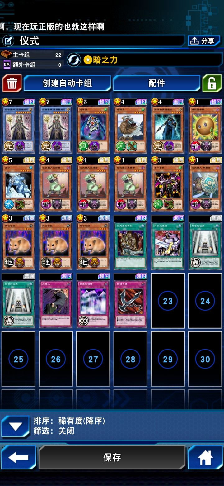 由于42关的任务要求20次仪式召唤,我个人又喜欢战队里换出来的破灭女神,于是就组了这么一套,核心思路就是配合高打点小怪站场,比如主持者和青魔导在暗之力的加持下有2000打点,一般只要不顶着对面的后场主动攻击,都能站两三个回合。配合仓鼠和多鲁多拉的二次回场,苟出仪式魔法和仪式怪兽。巧诈师处理手上的废件(布置者),增加站场能力,龙冰也是一张好卡,特招加送墓仪式魔人杂鱼有个小提示,龙冰在手上发动
