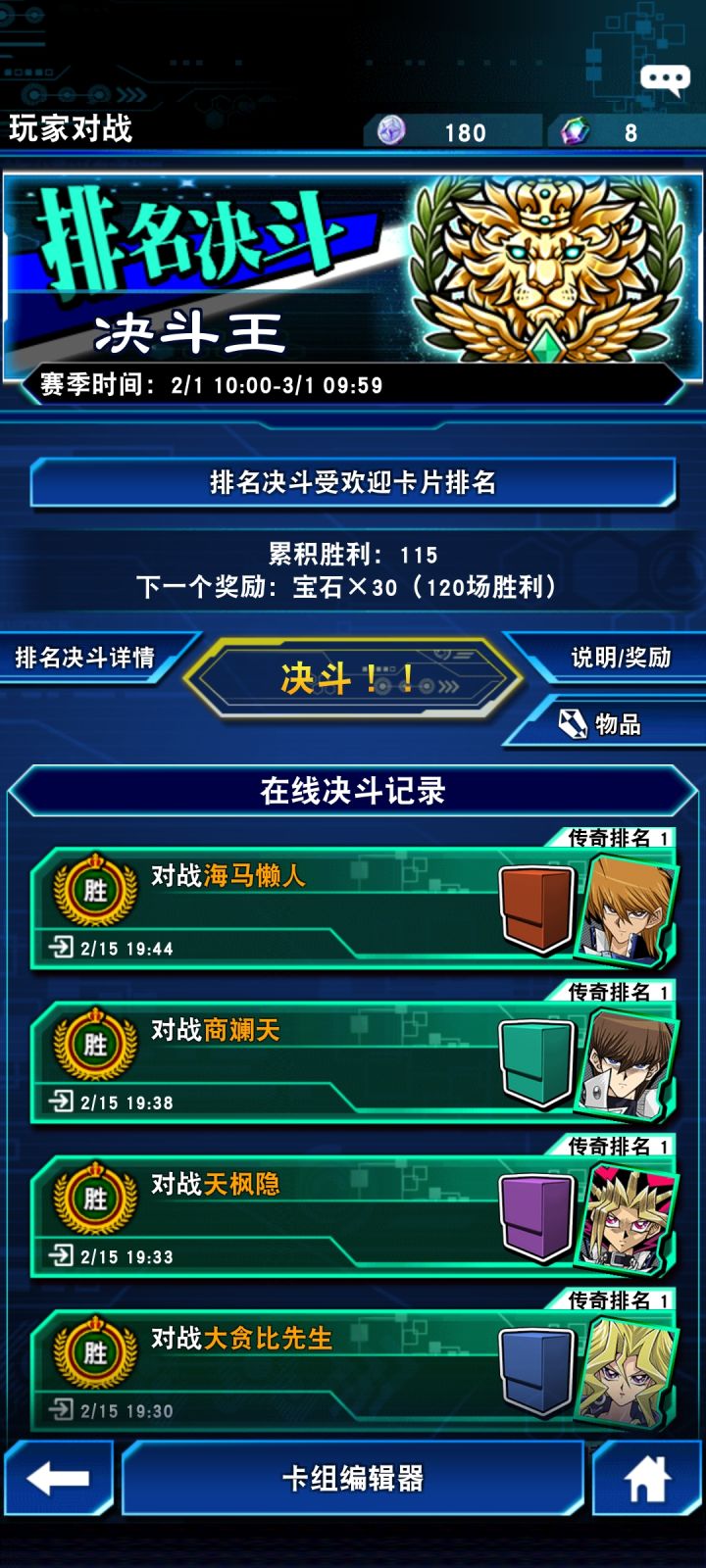 115胜场上王,一路连胜,感觉还挺快的,推荐下卡组