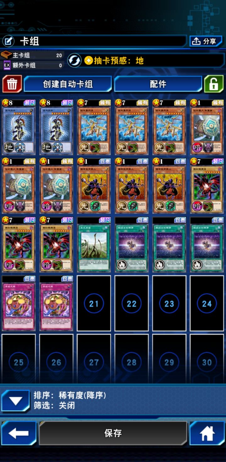 这套卡组主要是娱乐卡组(图一),比较针对一些阴间卡组之类,基本上一二回合,就能出无视陷阱的混沌士兵来压制场上,主要打法就是用混沌力场和鸟拉混沌士兵和仪式召唤(图六七),拉出无视陷阱的混沌士兵再加上仪式之槛和破鞋大剑所带来的无视怪兽效果来打暴阴间卡组(图345),运气好的话(图二)一回合三怪还能剩张牌,依靠仪式之槛也能打打亚马逊这种(图五)。技能的话,随便带个人比较推荐抽卡风抽卡地之类的,你要是相信