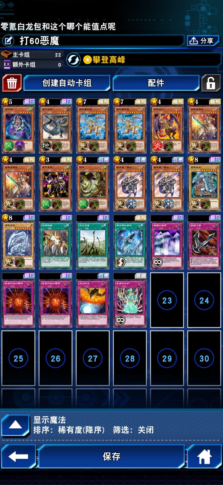 之前有大神分享灵魂卡组打恶魔的方法,怎么说呢,1是不喜欢灵魂卡,2来也没想去抽那个包。我这个卡组就是龙族卡组略微变化来的。1是龙族打点高,大哥站场的话不会被恶魔强吃,2龙族自带很多挡炸手段,3龙族特招能力强,4便宜由于恶魔的破坏效果充满了不确定,所以其实算是几个boss中最难保证全任务完成的,测试了几轮,效果还不错。由于破坏效果是随机的,所以我们的思路就是场上尽可能多地铺卡,以保证龙族大哥别被炸