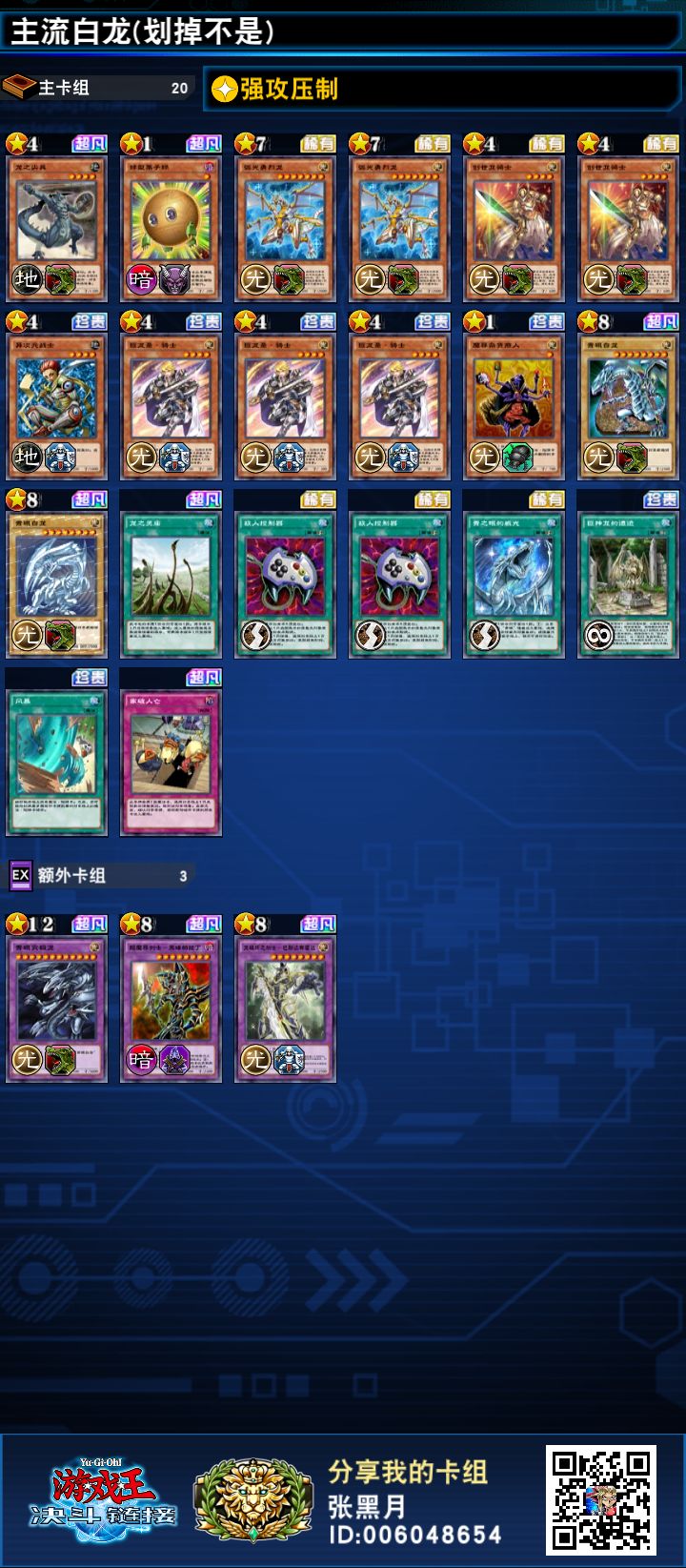 圣龙骑 核心卡,这里有俩个一个是弟弟给的一个是卡盒里的,卡盒里下3没有争议(强无敌)弟弟给的那个就说法大了,这个不带卡组检索但是有墓地回收各有千秋,而且装备白龙的话打点有2000是个很客观的面板就算一般装备弧光也有1700,但是缺点也有先是如果先上手的话就会很呆是上手时容易卡手的牌具体为什么卡原因用过都知道是一个卡手点,主要功能还是后续的回收和持续战场,但是白龙持续站场能力已经很优秀了,所以我这里是去除了,主要原因是去除卡手点增加下线,喜欢的人可以带一张。