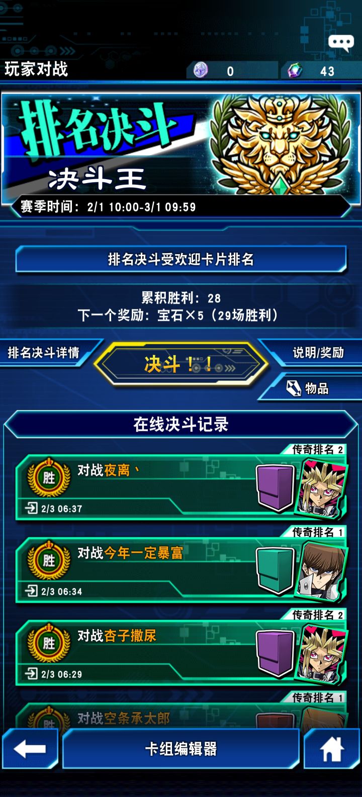 碰到好心人了,上王晋级赛碰到一个传2,心想十有八九不会让,怕是又要仰卧起坐了,结果对面就开局上了一个苍炎剑士,一个亚马逊和秘宝,还用了一个亚马逊的意志,坑是一个都没用,我开局还卡手了,出去一看卡组,3镜壁的大佬,而且卡组很强,估计没用上图我的下图他的😁