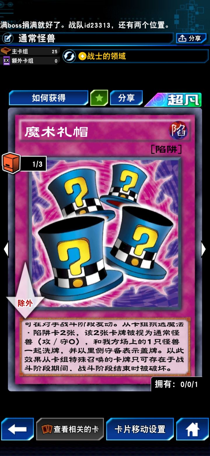 分享一个第27关的任务“一场决斗中发动10次陷阱卡”这个任务卡了我很久,主要是低级的对手很多陷阱没机会发动,而高级的队手硬拖回合会翻船,所以陷阱卡推荐不挑时点随时能发动的,比如光之封扎剑,强欲之瓶。重点说一下魔术礼帽,发动以后选两张陷阱卡到场上,如果对手把这两张陷阱卡战破,也是算陷阱发动的,所以一下就算发动三张了,效果非常好。
