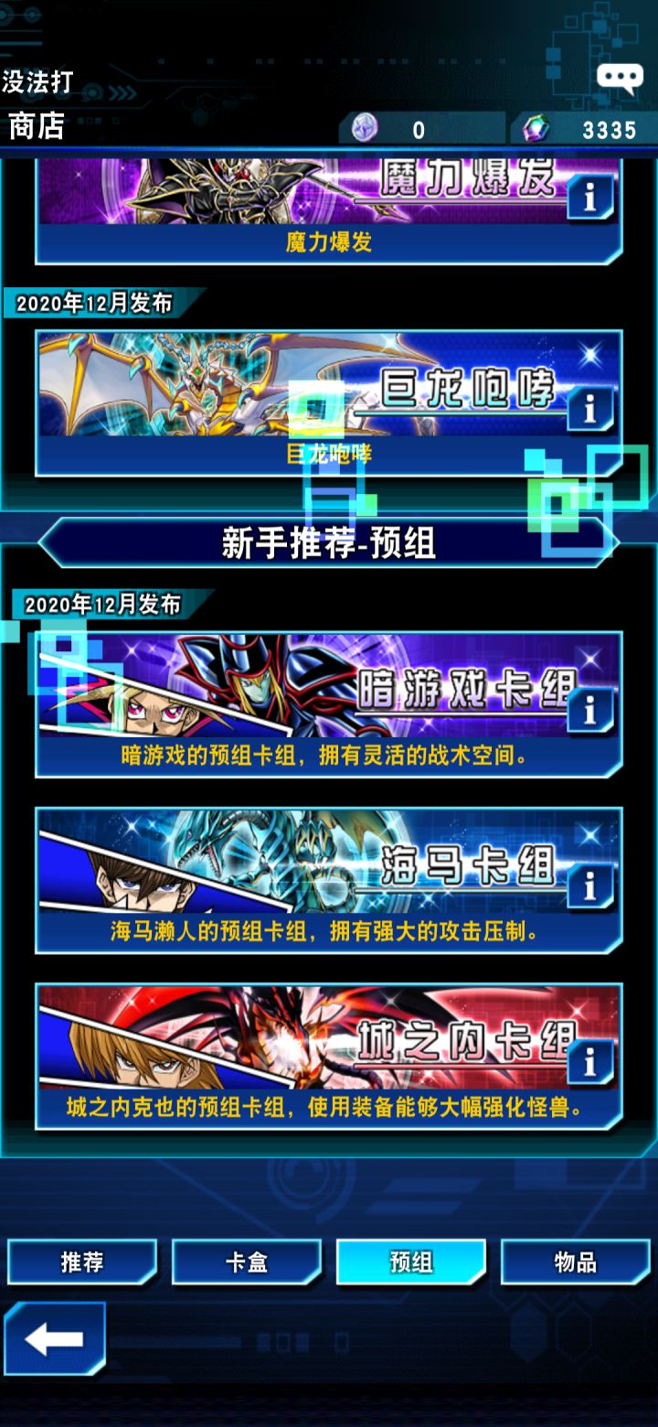 没有单独买卡包,把下图中除了魔力爆发之外的四个预组卡组买了,凑齐这套新手龙族卡组,以前玩过游戏王ygo,但是很水,所以这套卡组并不是很强,青眼白龙三张有点多,容易卡手,不过应付日常决斗足够了,以后再慢慢换卡组吧😄