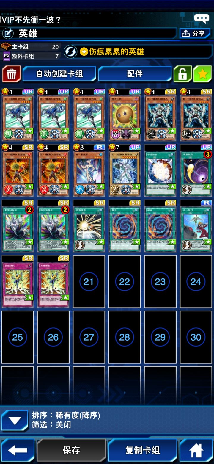 英雄卡组 强度嘛 月初 我用它只打到了传奇二 还是能勉强打一些卡组的 不知火 青眼白龙…… 毕竟要情怀的嘛 强度肯定比不上主流 宇宙旋风可以换成正义审判 次一世代 是想不出来带什么卡片 才带的可以检索卡组 墓地的E·Hero怪兽和栗子小球(包括各种新生空间英雄 各种栗子球) 有更好的替代也可以换 我就不多说了