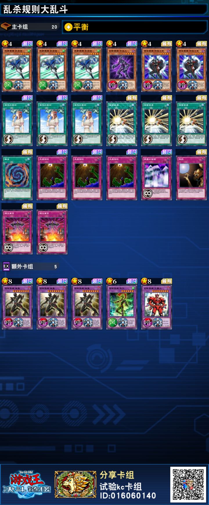 规则大乱斗乱杀卡组推荐打了会基本冲分快的只有三个卡组,金宫石头,神鹰剑斗,英雄,除了神鹰剑斗另外都不带额外,目前这套英雄没输过,神性人还能拆金宫狩猎场,平衡保证上手一张英雄发挥稳定。这套可以说比另外俩发挥稳定上限还高几乎随便乱杀