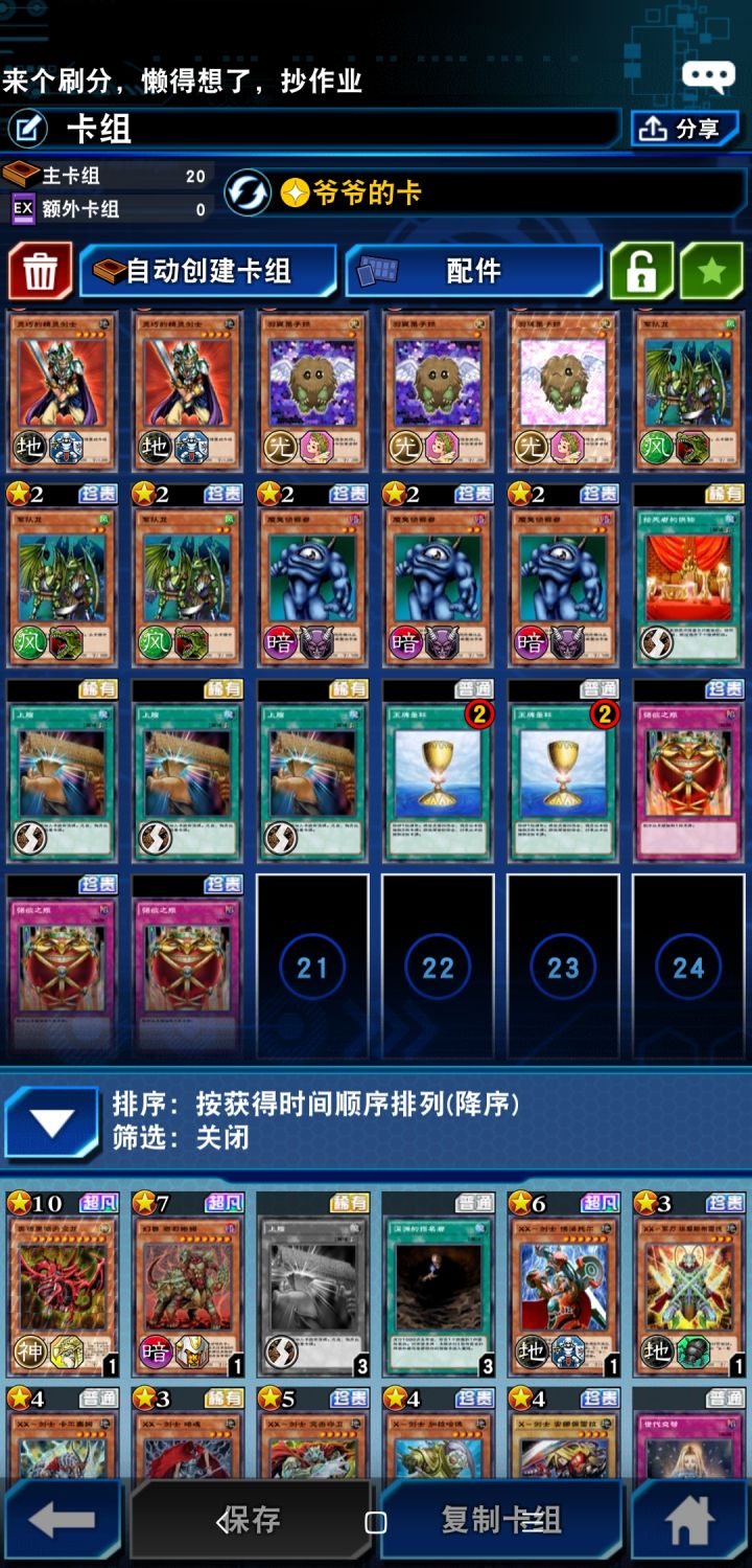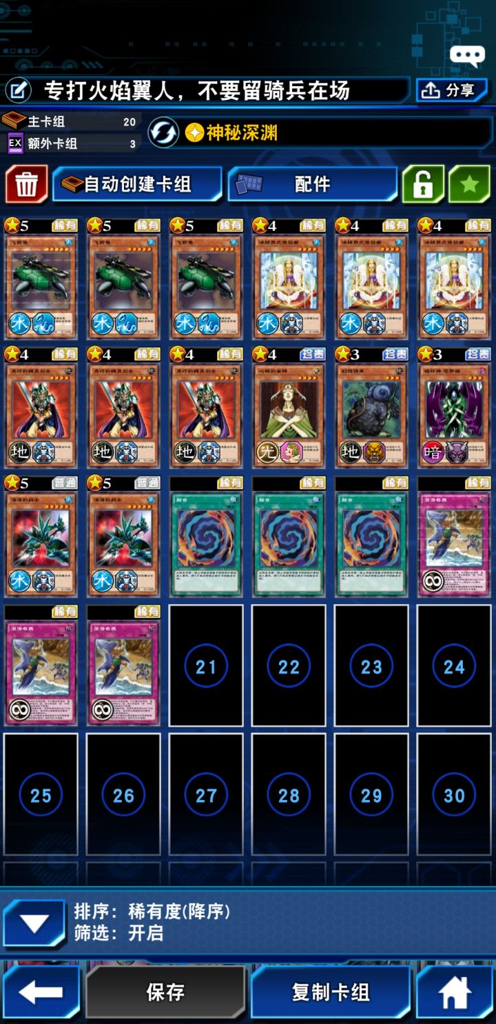 要点是第一个妖精剑士和冰结界要攻击表示挡第一轮,9成他打不死你,你的下级比白板英雄好,上级怪又过不来,双挚爱的火焰翼人最多打你3200血,他手牌空了,转防就好。我原来构筑是带的鲸鱼,因为如果是鲸鱼的话,下回合随便下个怪直接拉鲸鱼拉潜海,你就安全了。不过我们现在是廉价版本,所以姑且随便换两个。潜海场子做出来就等于无敌了,实在没来,就上骑兵吧,但骑兵站场虽然不会暴毙,无效电脑装备要丢手牌。最后可能做不完任务。所以我一般是融合骑兵然后当祭品解放,乌龟直接祭掉骑兵就够效伤了