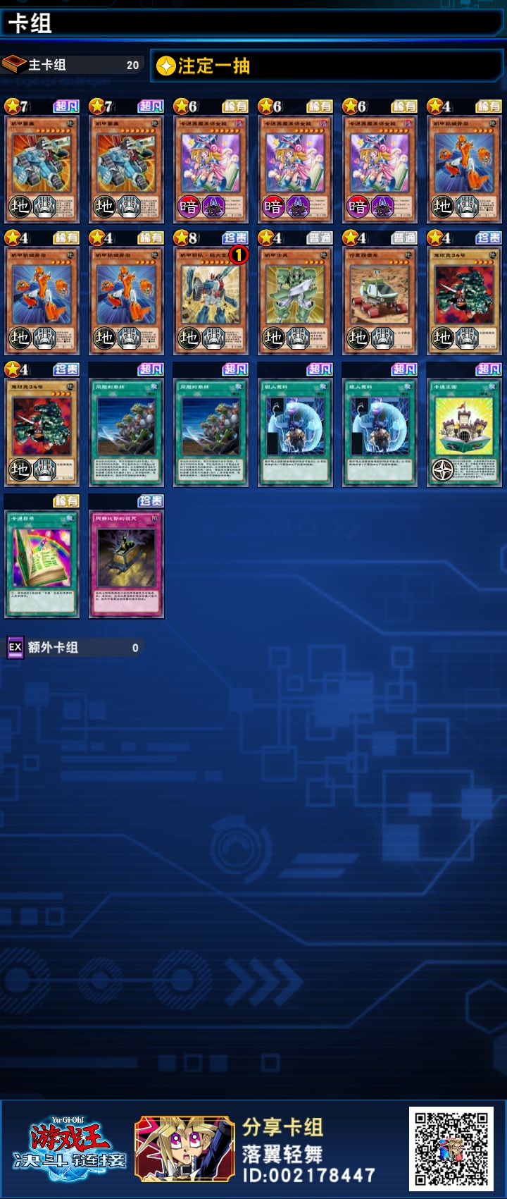 结合新卡构筑了一套卡通机甲,有一点强度,怕风。思路是召唤任意四星地属性机械怪,同胞扣2000血检索行星探查车,发动探查车效果检索卡通王国,下回合注定一抽检索黑魔导女孩。场地不被解基本赢了。