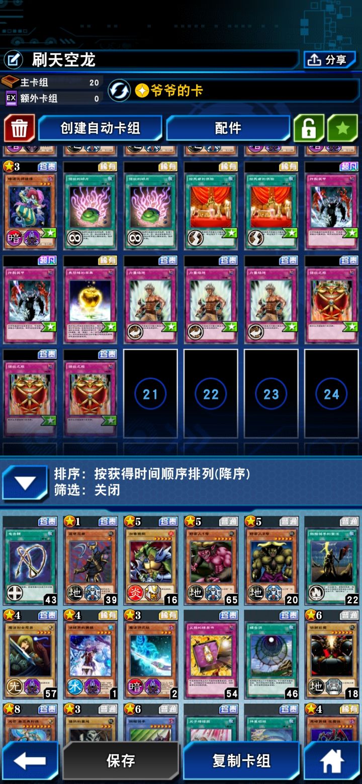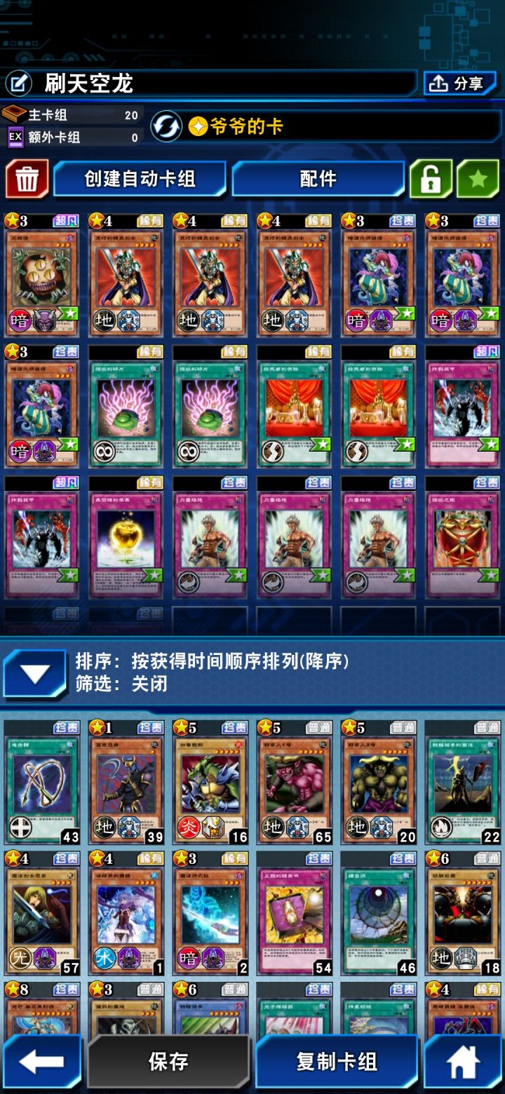 超低成本拿天空龙起手没精灵剑士直接退,有的情况下想办法让人机自己把黑魔导铺满,力量场地破千把刀,死者供物和爆裂装甲破魔导剑士或者黑魔导之杖,剩下就是挂机赢。其实这套不用爷爷的卡这个技能都能疲劳死对面人机,核心卡就是精灵剑士、力量场地、死者供物、爆裂装甲这几张,其他随便搭。
