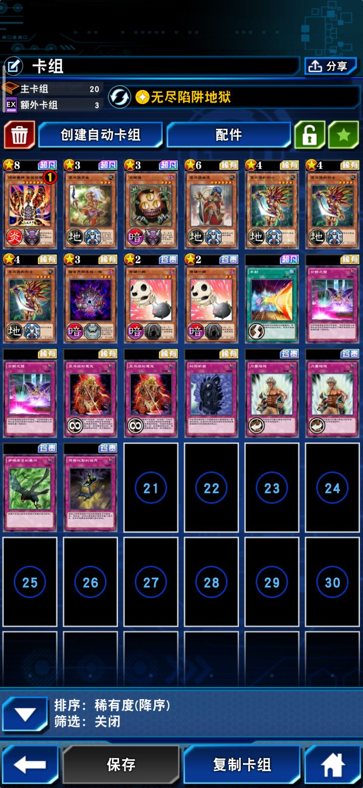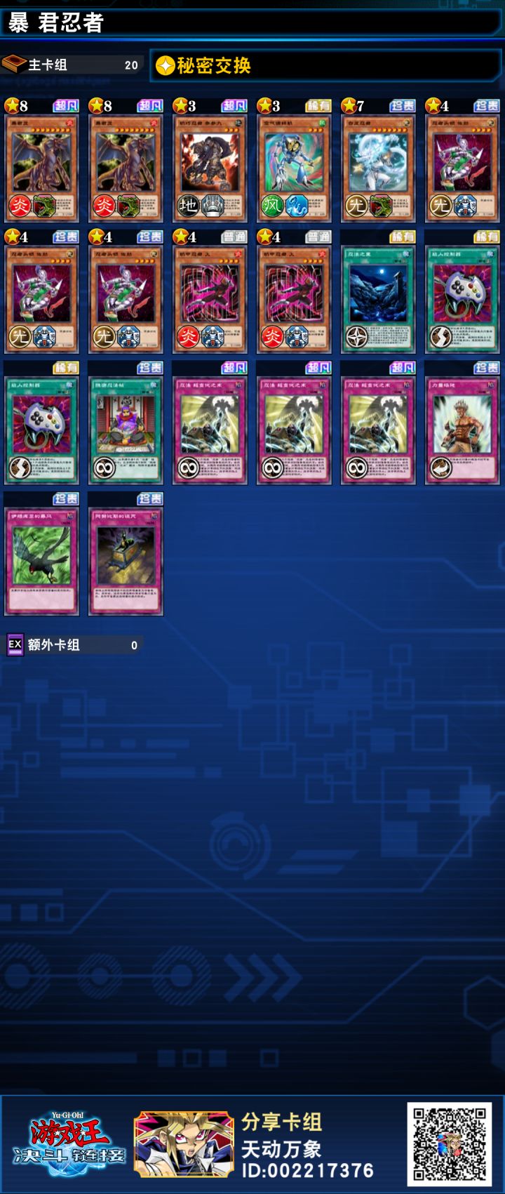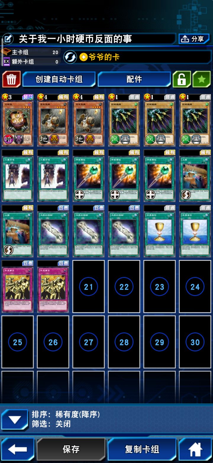 分享一套暴君龙忍者,忍者卡组目前最大的问题就是检索,上级怪的话去掉了没什么用的黄龙,选择了压制力较强的暴君龙(想满3的,但只有两张),下级怪带的萨斯给可以跟转换表示形式的魔陷打配合,火影可以加星级配合超变化,空气循环机防止暴君沾手,打了一下午感觉强度还不错,有兴趣的朋友可以试试。
