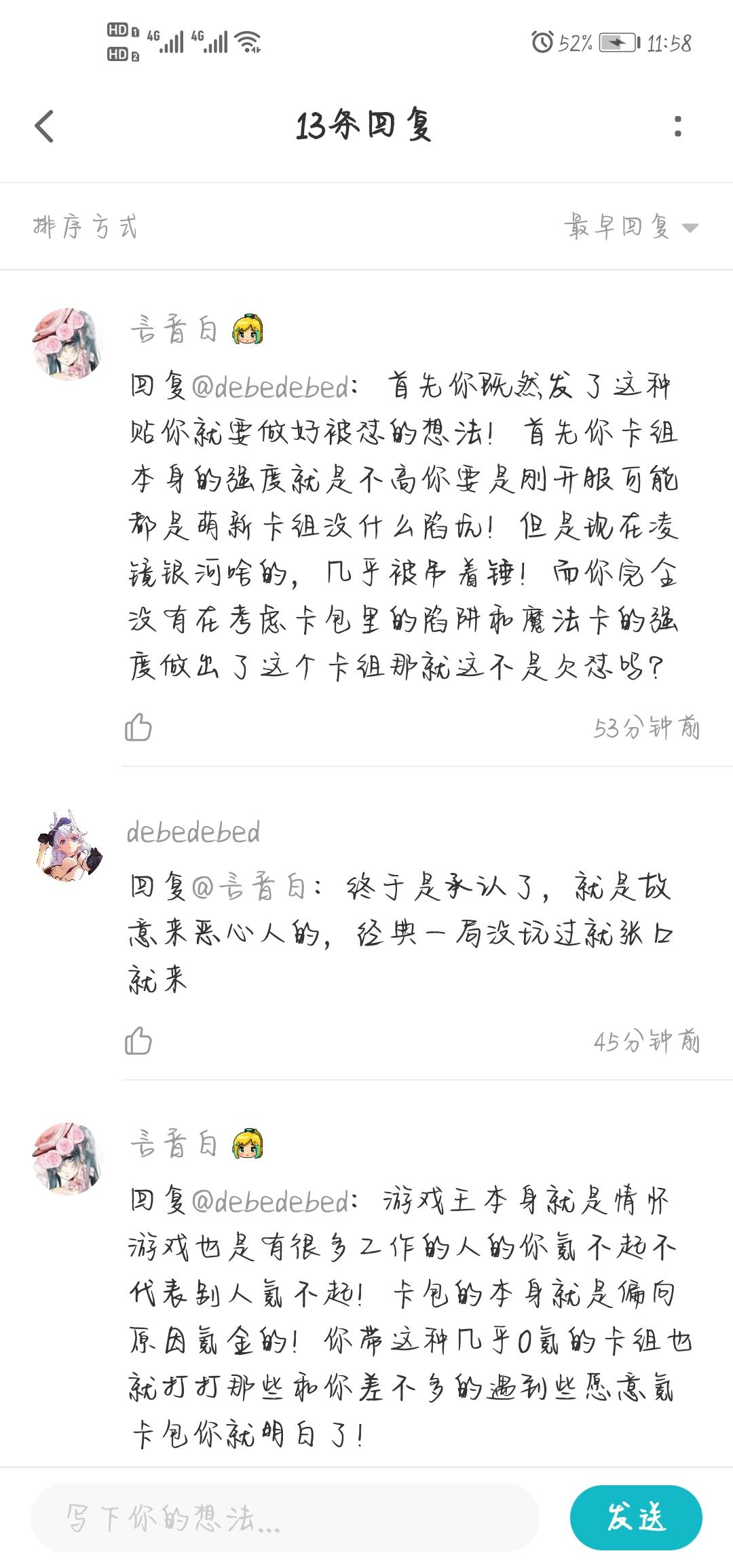 昨天发了一个阳炎的新思路。我不知道为什么在一个游戏里找新思路,新理解,尽量推出0氪,微氪的内容还具备一定强度还要被喷,张口闭口强度不高,是啊,你带三镜壁,你玩守墓,有什么卡组又能好打,说我打不上kc二十,我用香水阳炎,神鹰六五,亚马逊打上去了,然后又嘲讽我氪不起钱。理想里的这个游戏难道不应该是百花齐放的卡组的吗,不应该是不断有新的玩法新的构筑出现吗,你当追版本,当网易的孝子没人反对,但我发一个