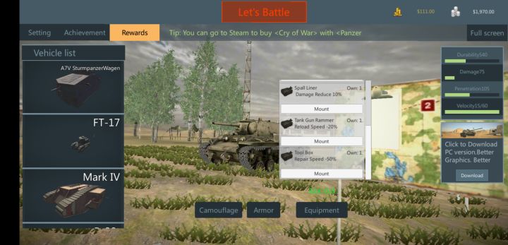 更新日志:改进历史模式 玩家可自定义对战车辆增加部分汉化改进悬挂效果修复配件 无法在战斗中使用的Bug修正 车辆容易翻滚的问题修正 UI 大小问题修正 涂装 无法在历史战中使用的Bug现在,历史对战模式可以自定义对战车辆与数量。 可以选择队友与敌军的不同组合,游戏性提高。最后,国内请在TapTap下载游戏更新 谢谢。全网只授权TapTap,其他渠道均为盗版。Steam版