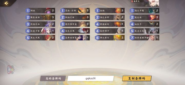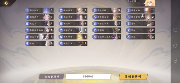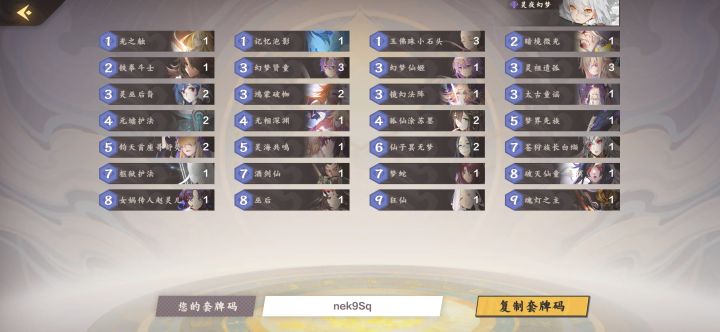 本人微氪党,如今终于上了至尊,分享一下自己的灵卡组,我玩仙剑九野已经很久了,在分享卡组之前我想先谈谈目前的天梯环境,如今的高分天梯环境我感觉就是阳和雷的天下……狐仙换的必要性也越来越大了,毕竟放法术就回五点血,如果想和阳或者雷一战,那么最好的办法就是组一套土卡组,便宜且有效针对阳和雷,建议圣位5或者圣位6组一个用来上至尊,即使遇到一些快攻卡组或者其他卡组都有一战的资本,基本就是这样一个情况。说回我分享的灵卡组,是我一直以来上分用的卡组,优点是前中后期都可以打,基本不会有很大的劣势情况,缺点是后期拖不过阴阳雷,重在打节奏的一套卡组,组了绝对赢多输少,有我独特的一些见解,既不缺大哥,削血能力也强,感兴趣的朋友可以组组看试一下,卡组本身有那么一点小贵,但是很多东西都是可以替代的,希望大家喜欢