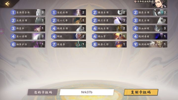 图文无关的前言分割线==================九野,营养丰富,美味白兔。代吃疯狂星期四。==================这次给大家带来一副不正经的快攻卡组。是基于21年⑨月的圣俑木为基础发展来的圣俑卡组。如果你是玩习惯侠客土快攻的玩家,可以试着换一下口味。卡组码:Nrk37b1.卡组构造是以部署铺场为主,法术BUFF强化部署的标准快攻卡组。遇到快攻冲不了的卡组,该寄