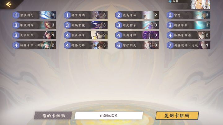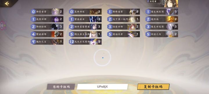 2022年08月本人在用雷卡组留存前期:双剑(雷炎桃木剑+紫英授业)配合魔琴及小紫英进行伤害压制。中期:祈仪召出魔琴+小紫英+龙图,当回合即可启动。后期:灵阵找高费部署,配合魂灯,随机应变。这套雷卡组我个人使用感受是【小快灵】。【小】:核心部署费用小、身材小。魔琴、小紫英、龙图基本可以随摸随下。卡组整体构筑0-2费卡25张,3-5费11张,1张魂灯9费,3张大雷12费。【快】:启动快,
