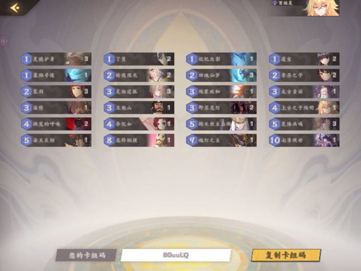 先放卡组,有时间再细写一下,碍于时间原因我没去继续冲榜了,就是完成10胜了事,但是强度绝对拉满!各位大神加油吧!现在开始讲一下这套为什么打封神强力。因为本次封神的规则是开局直接入手一张非巨型的神话部署卡,所以我们卡组只放了一张红卡,萧红月,3费不用考虑直接下场。针对目前比较强势的几个封神卡组,大致是辉空煜音金,魔免狂仙木,黑暗王桑瞑灵,阳内战一会另外讲解。针对以上这些,所以我们开局先找51