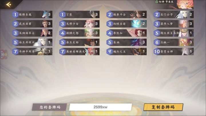 大家好,我是幻神,这个月比较佛系,基本是每天五胜就下线了,偶尔冲冲分,冲到了第11位。大家要是相信我可以直接抄这套卡组,主要缺点是太贵了,没有卡的萌新可以先不考虑,可以留言问我其他卡组。PS: 我自己玩这套卡的胜率有80%那样,主要杀风和雷。