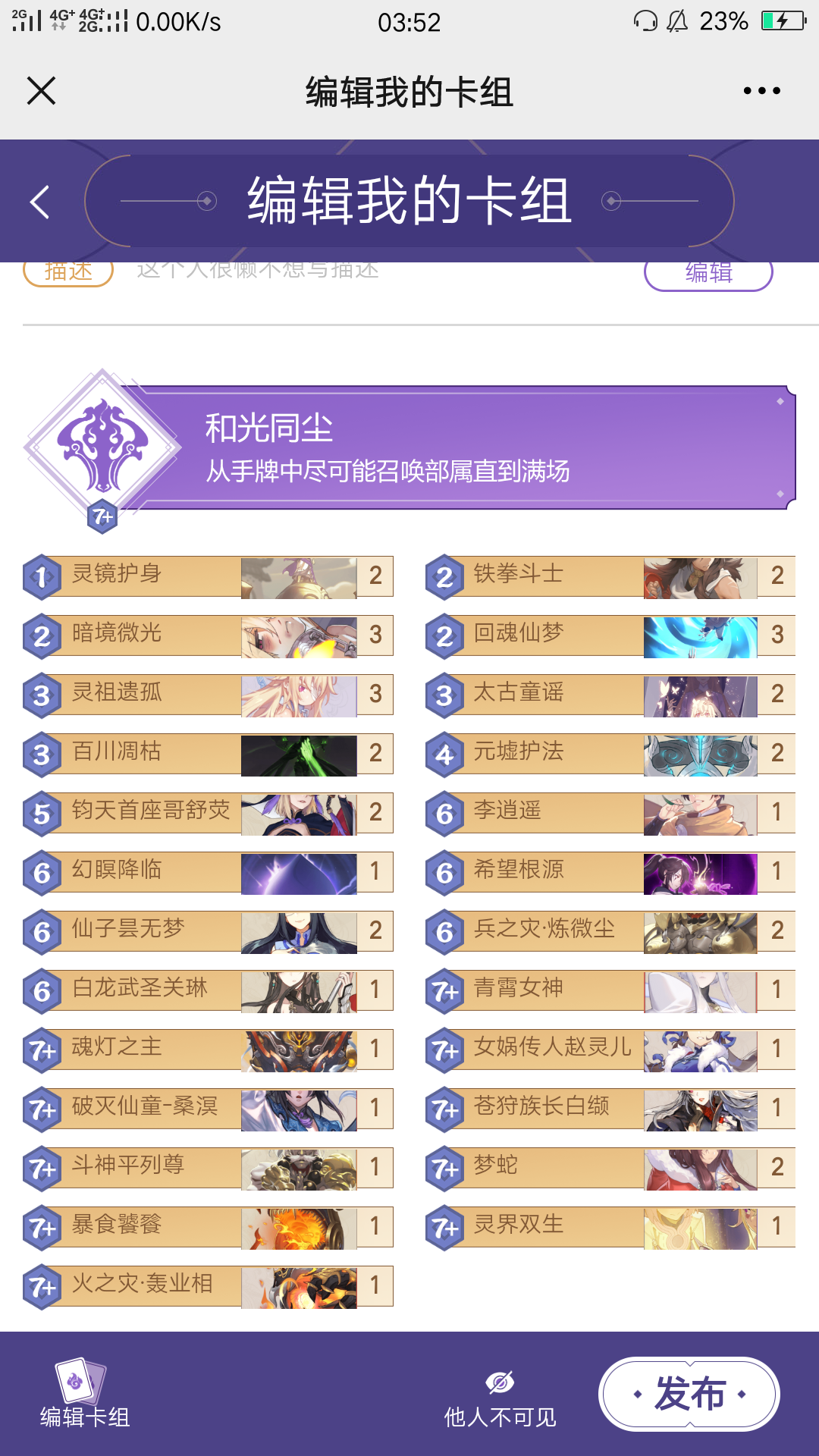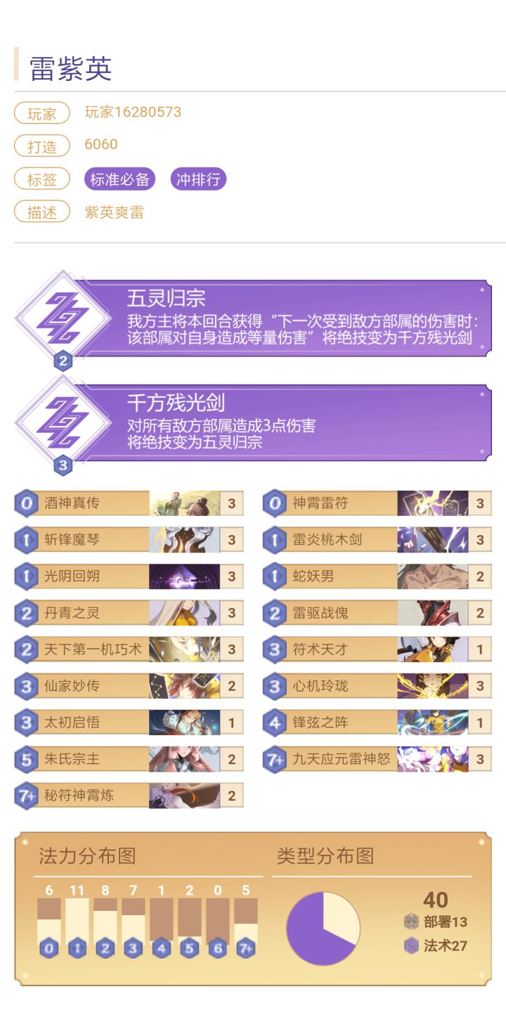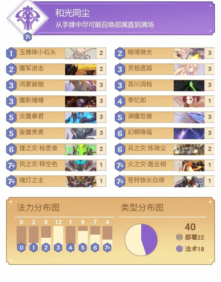 灵打快攻要活下来取决于跳完费之后下的大哥能不能反场,魔蛇、哥淑莹、幻冥降临老三样就不多说,新加的染三生 、兵之灾、关琳我非常看好。染三生配合回魂可以快速反场和解掉关键随从,对面可能还急着解你的染三生。跳到6下昙无梦的都知道昙无梦有多无力,可是兵之灾和关琳就不一样,兵之灾快速铺场挡伤害,靠随从冲脸的不敢不解。关琳玩过九野前身的都知道关羽关琳全自动解场,但是燃烧伤害比不比得过封印伤害,见仁见智,谨慎看好。火之灾,单纯是因为给0费伤害牌给笨.逼大哥灵走位和直伤而塞进去的,谨慎看好。766斗神直伤拉铁拳,铁拳人称金的爹。值得一提的是5费法术无面暗渊镜像可能不会触发入场效果,谨慎看好。