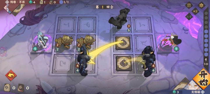 首先把35推到1号位,注意二号位泪之余烬别选定石狮子,选空格和自己的怪都行。第二个最墨迹的解法,泪之余烬给自己的傀儡,不屈给成体斗魔第三个把成体斗魔推到四号位,法术卡放空都行。最后安利一个所有残卷的解法。先去剧情那做个食物再打。随便过。