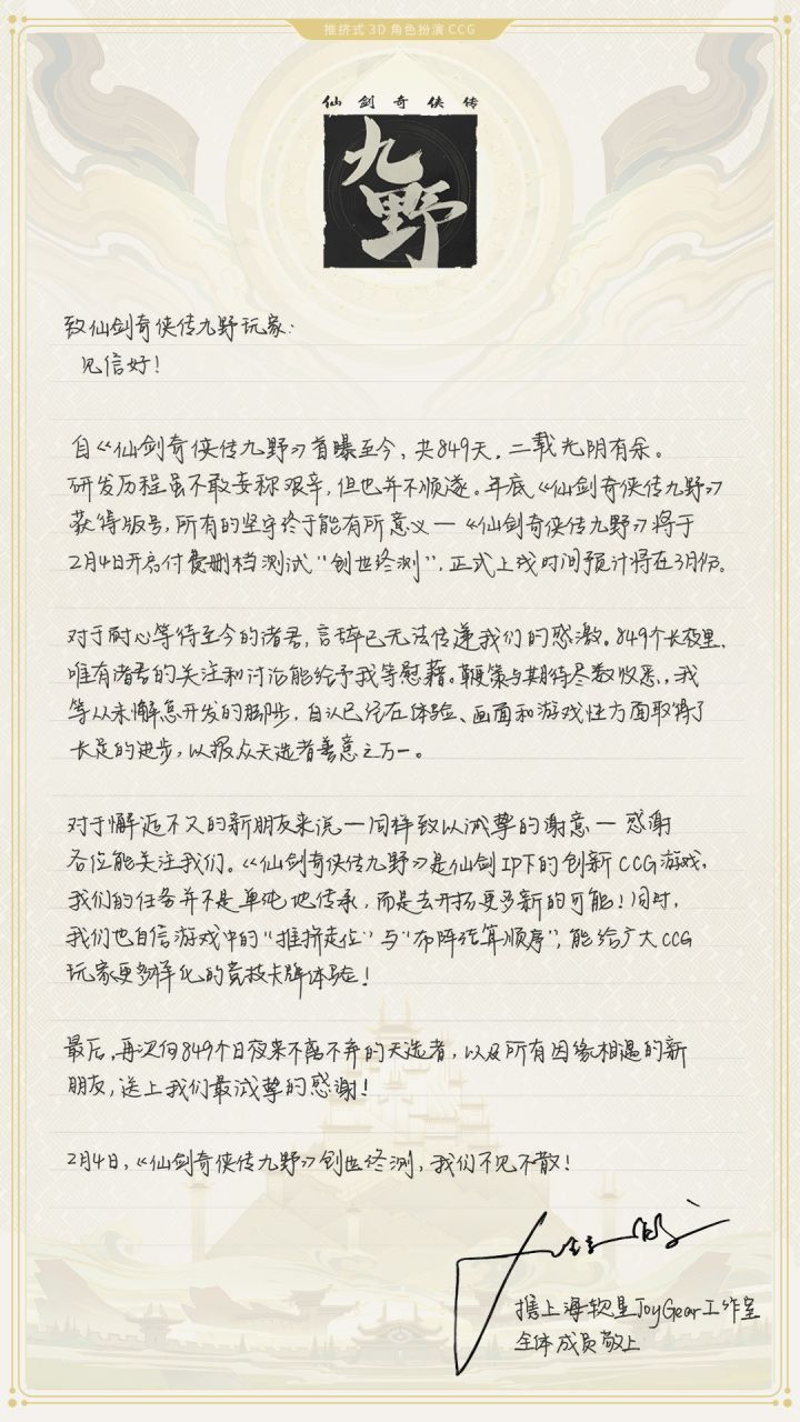 2月4日2月4日九野不限量测试了!最后一次最后一次测完很快就上线了!亲爱的天选者们,您现在收看的是由小苏携左左和右右独家播报的特别节目「今天九野上线了吗」(误)……要说自从我们拿到版号了之后呀,制作组全员都开始007肝进度中,小苏每次经过一鸽都能看到他座椅下掉落的一地鸽毛(右右:是头发啦!)那么,总之今天要带来的好消息就是——《仙剑奇侠传九野》2月4日 不限量「创世终测」启程!昨晚