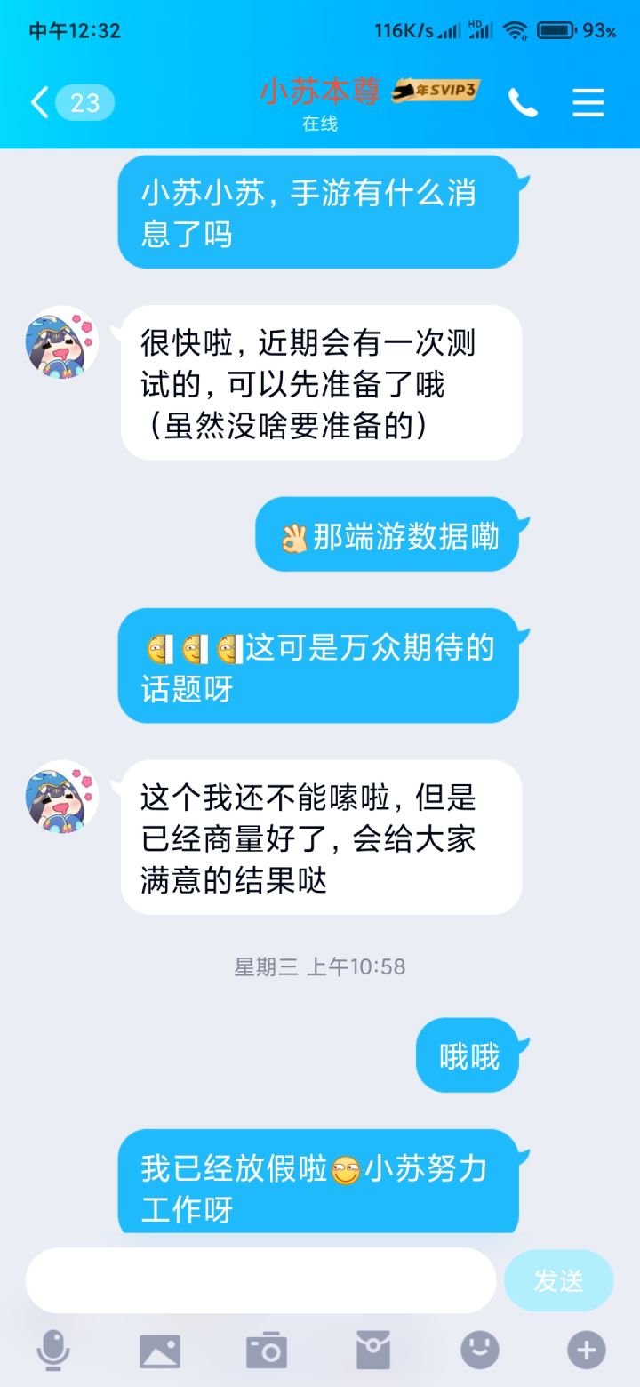 小苏说,近期会有测试呦,我猜是不限量测试,,,毕竟游戏再不出热度就快没了