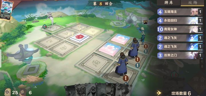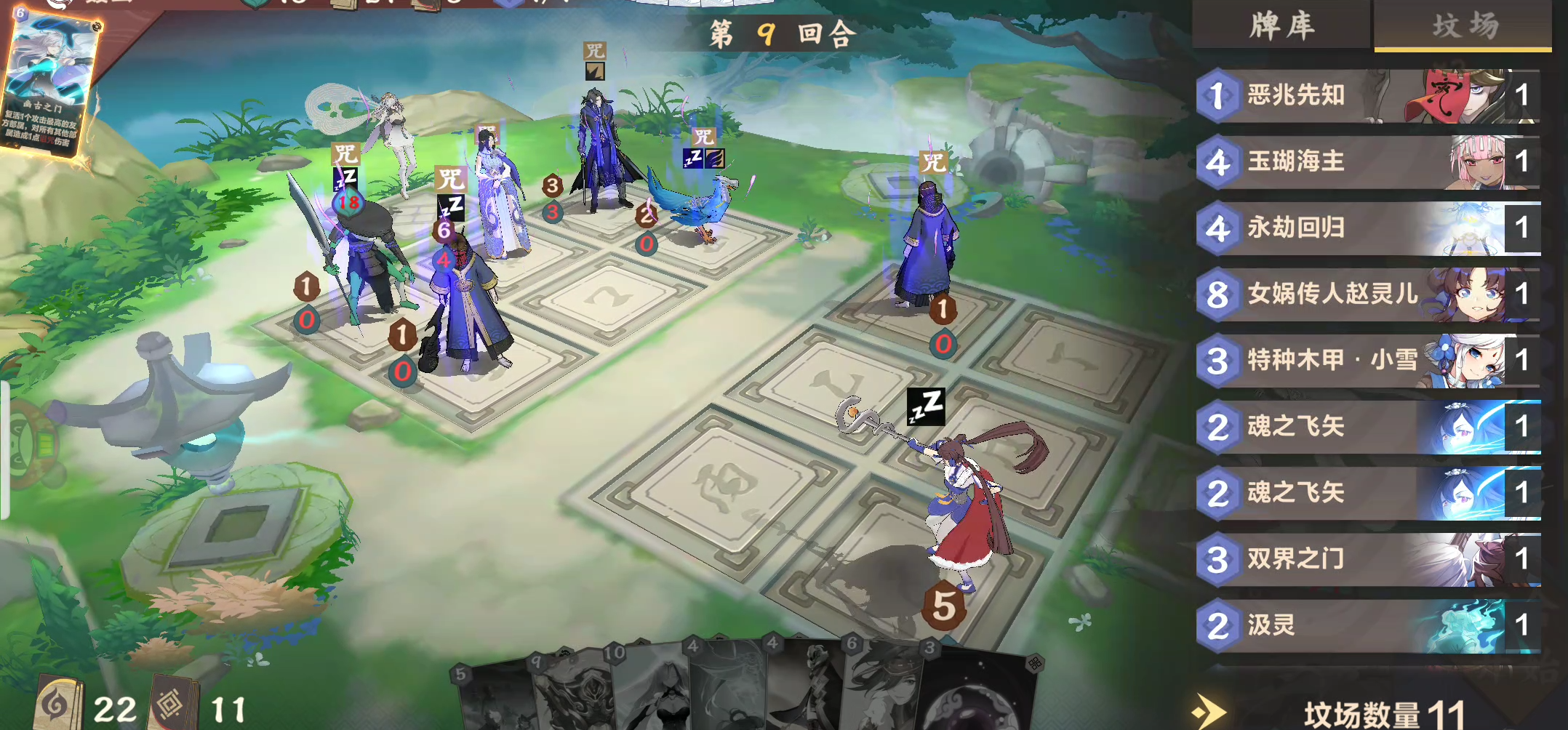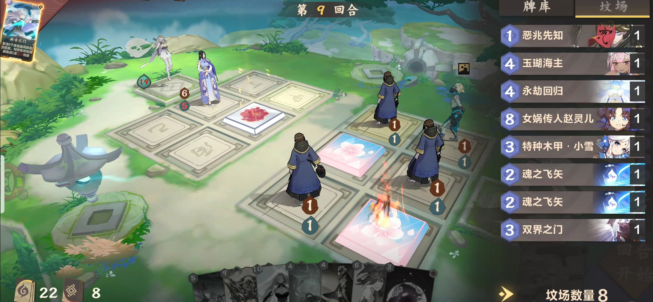 女神去哪了?第8回合开始:坟场卡牌数量6,青霄女神在坟场第9回合开始:坟场卡牌数量8,新增1张恶兆先知、1张小雪、1张灵儿,青霄女神不见了第9回合幽莲大招复活的是5攻灵儿,而不是6攻青霄女神。被风吃牌,被阳吃牌,这是还被系统吃牌了嘛?