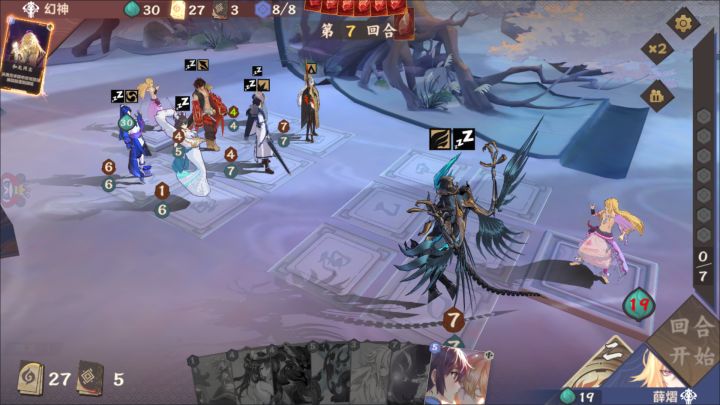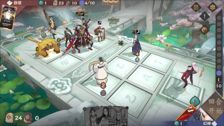录像码在评论区放出,有兴趣可以观看解说一下。梦璃对幽莲,一个化身灵一个复活阴,单就角色来说难说优劣,或者梦璃占优,阴优势梦璃反制措施会很多回手和大招,而化身起来后阴只能以大招清场还有一定延迟,较难做出有效反制。开局留牌幽莲:砍头,行军,双界,黑衣梦璃:两张2费跳费,一张碎片,一张根源单就起手来说,两方都算是胡牌,幽莲前期解场足够,梦璃前期跳费足够,双方五五开。一回合梦璃下鱼,二回合幽莲