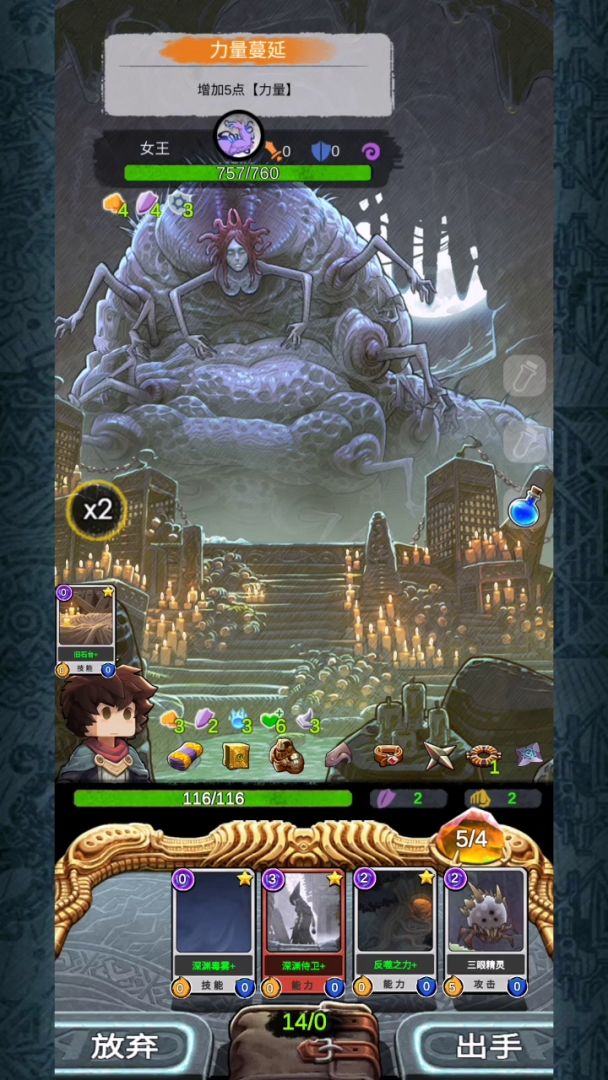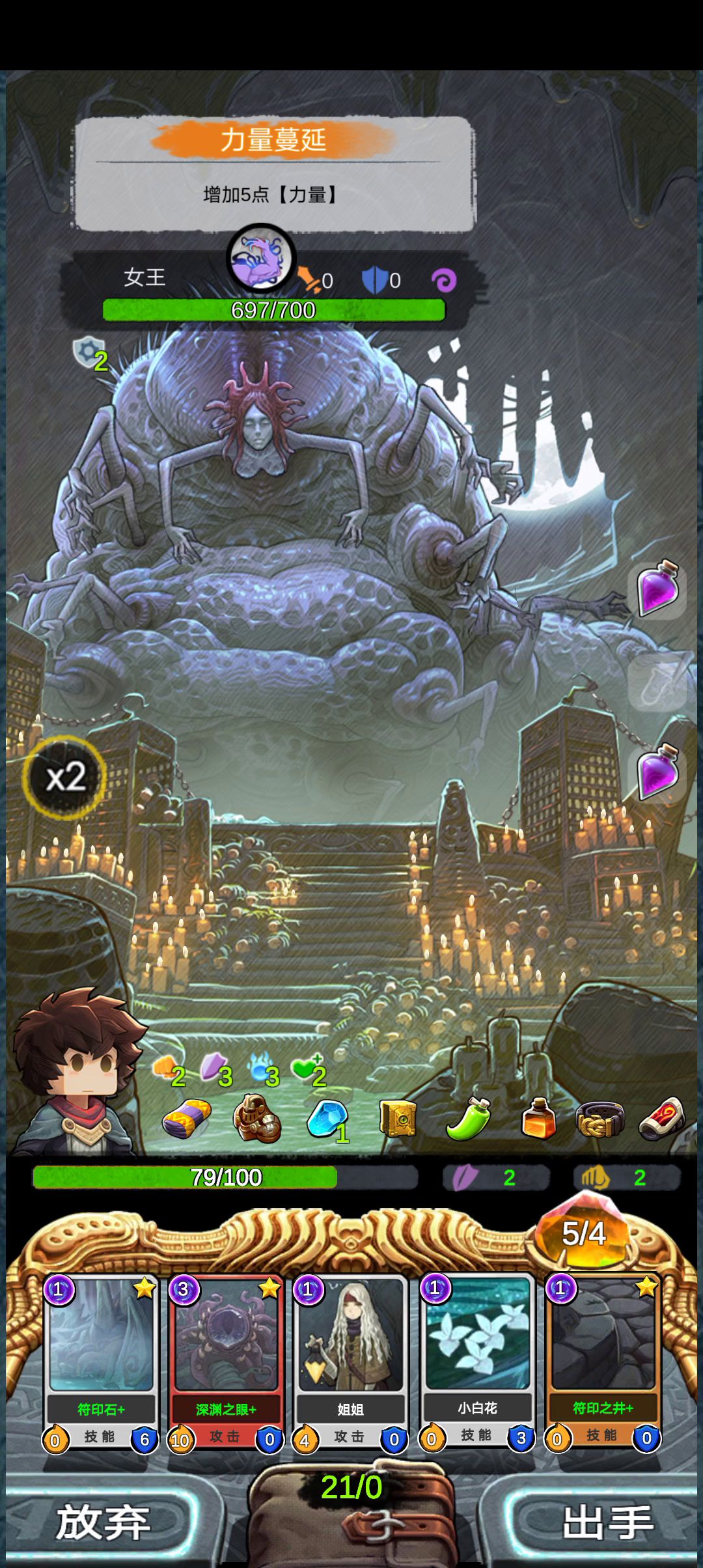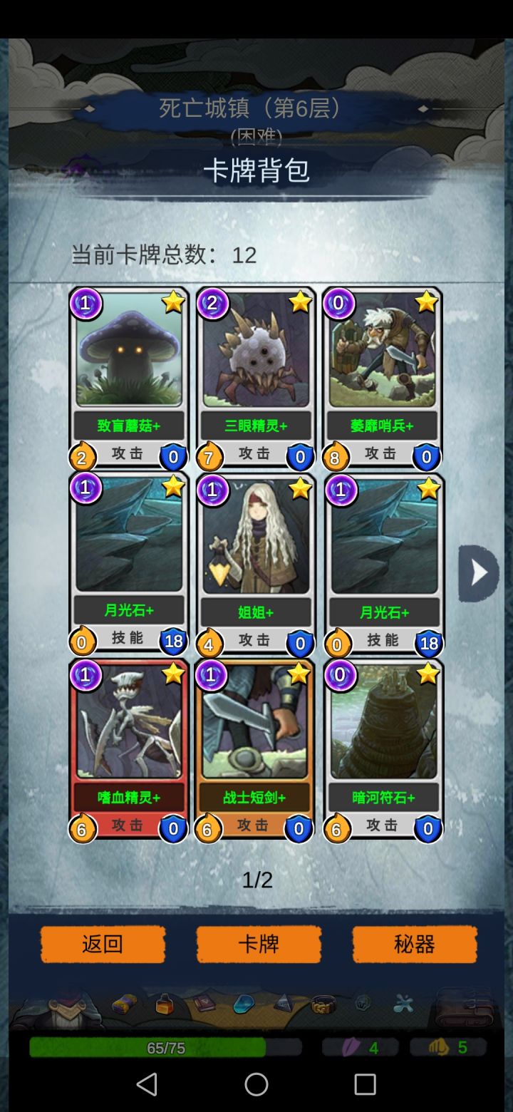 第六次挑战困难模式,居然用自己不看好的方法过了,写点类似攻略的东西。。大体思路:通过削自己的血,换取力量(诅咒洞穴),后期反杀不争不抢,缓慢发育,以血换力,后期反击(除了少数需要速杀的精英怪,大部分boss和小怪都可以先苟后猛来打死,第六关有时力量可以堆到30)关键卡: 月光石+*2 愿望精灵*1/2 符印之井+*2诅咒洞穴*1/2 符印石+*2 隐秘树洞+*2运气卡:猩红草*2(随机