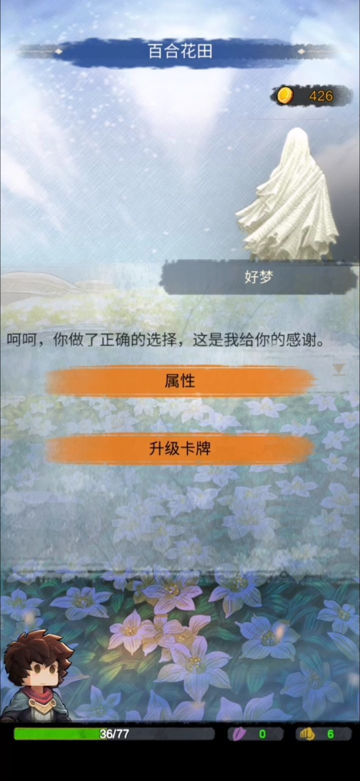 第三章就是一条直线的剧情,没有支线剧情这样。也只有好梦还有噩梦的选择,稍微讲一下。把莉莉莲的百合花选择给好梦还是给噩梦?①给好梦,提升属性(1点力量或者1点坚韧)或者升级卡牌②给噩梦,恢复血量或者升级卡牌反正我是恢复血量,因为那个时候都不需要属性的,或者升级卡牌什么的,一路下来打怪没得回复血。选择这个的时候只有一半血,我。