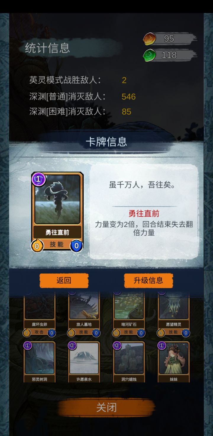 1、如果想通关深渊困难的话个人建议在力量天赋点满前想都不要想,最好在力量点满后基本把生命也点满,然后再考虑通关深渊困难。2、既然是肉鸽游戏当然会有流派,这个游戏个人感觉主要分为四流派,叠毒与力量,还有防御与诅咒。抛开流派的强弱,我先说最重要的稳定这一点,也就是流派的核心卡是否容易取得,这一点上力量流要完爆其它三个流派。为何呢?很简单的问题,因为力量流的核心卡只有一张,就是勇往直前这张卡,这张卡的